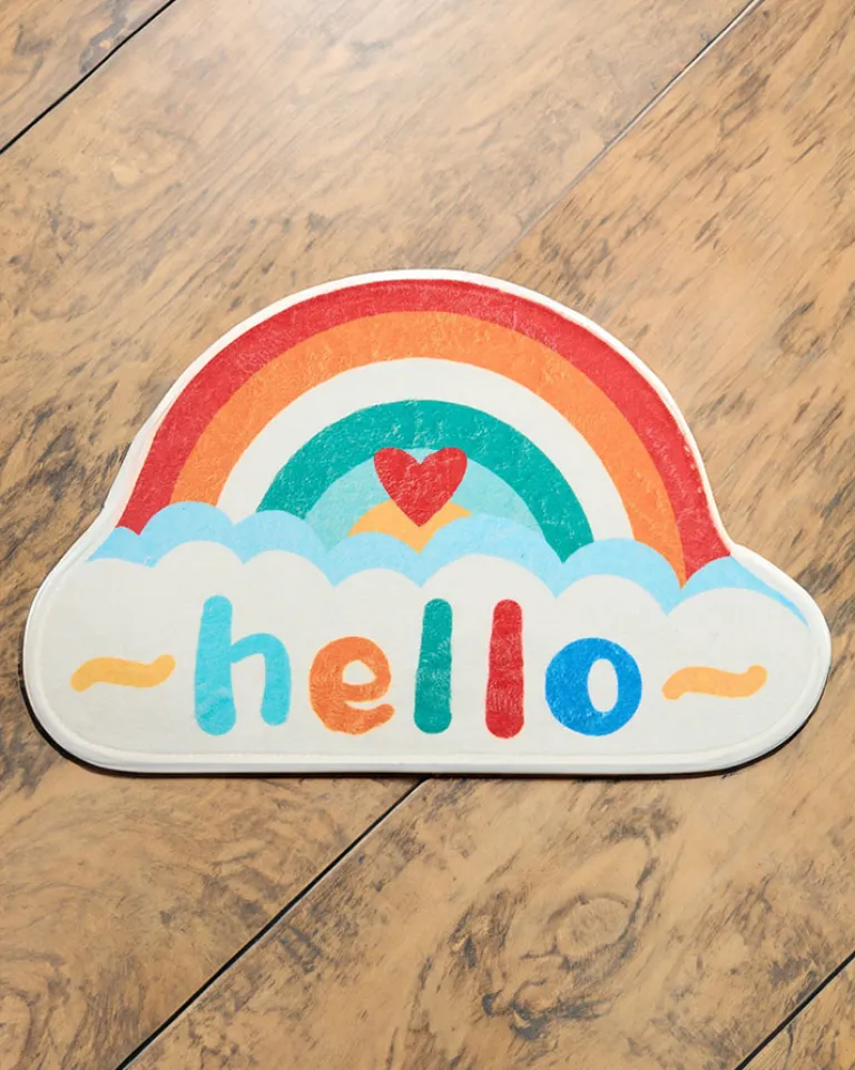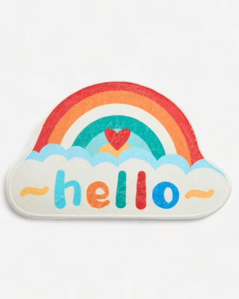 - Mały kolorowy dywanik wycieraczka z krótkim włosiem i napisem ” Hello”. Jest miękki i delikatny, przez co niezwykle przyjemny w dotyku. Dodatkowym atutem dywanu jest jego antypoślizgowy spód.