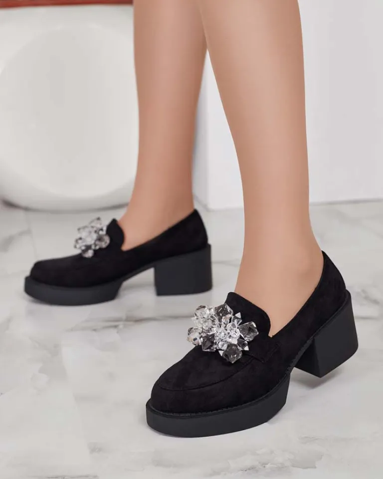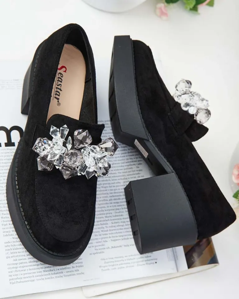 - Przepiękne damskie półbuty typu mokasyny na słupku. Model w tylu casual i jest wykonany ze skóry ekologicznej zamszowej i wkładki z eko skóry. Nosek zaokrąglony, zdobiony kryształkami. Idealna baza dla wielu codziennych looków!