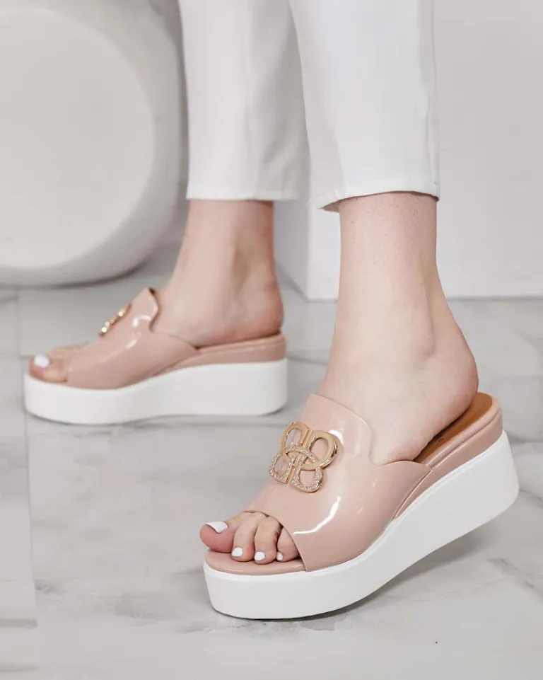 - Klapki damskie z eko skóry lakierowanej i eko skórzanej wkładki. Wysoki koturn i platforma dodaje uroku i charakteru. Ciesz się wygodą i stylem zabierając te obuwie na wakacje!