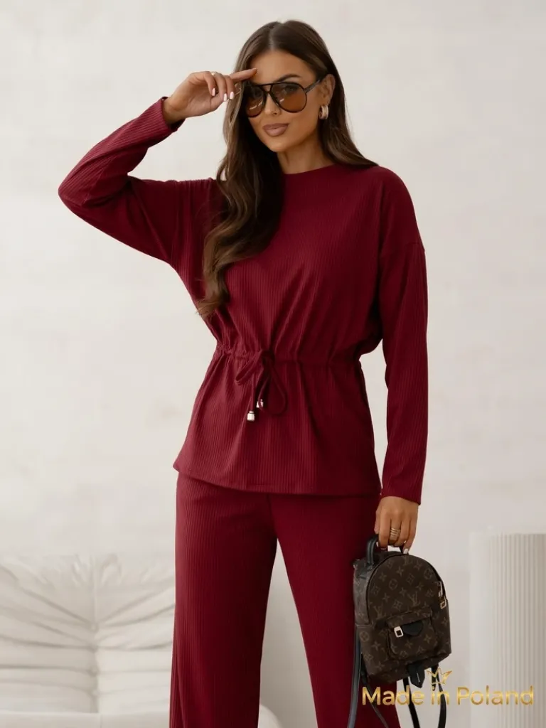 - Bawełniany Damski komplet a’la sweterkowy prążkowany Góra z długim rękawem i ściągaczem w pasie. Spodnie poszerzane z gumką w pasie i kieszeniami. Poczuj styl w tym wspaniałym komplecie!
