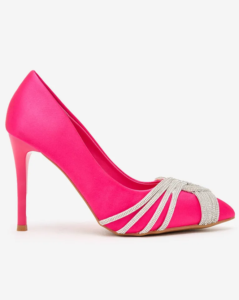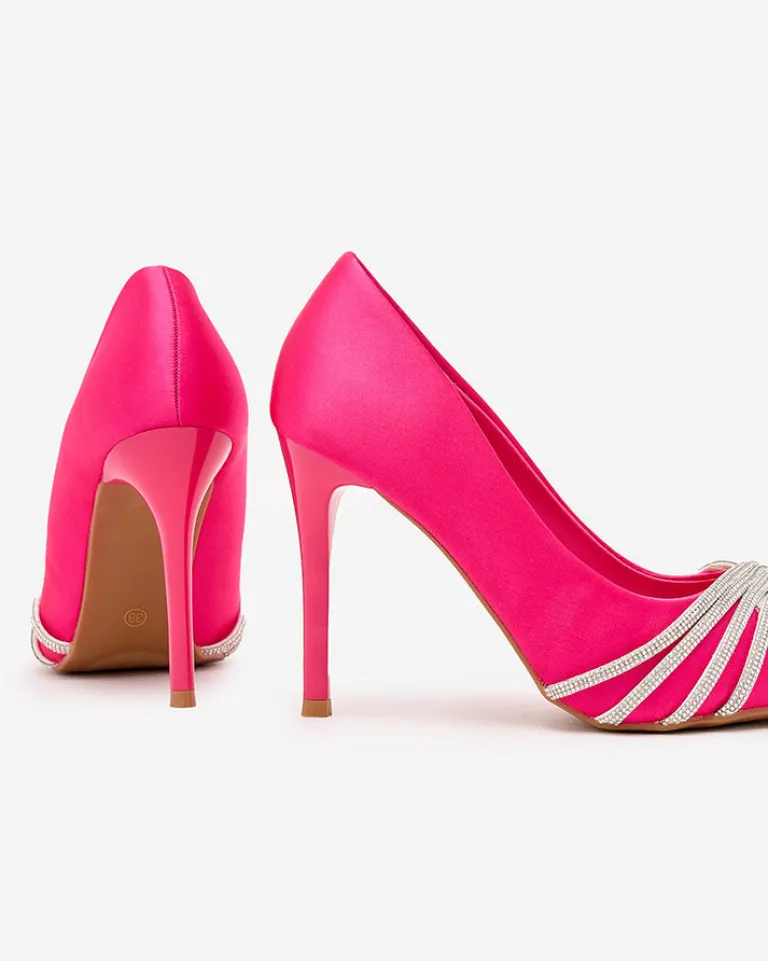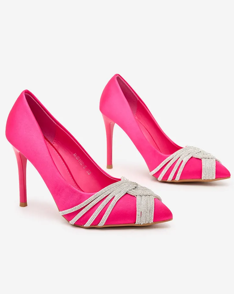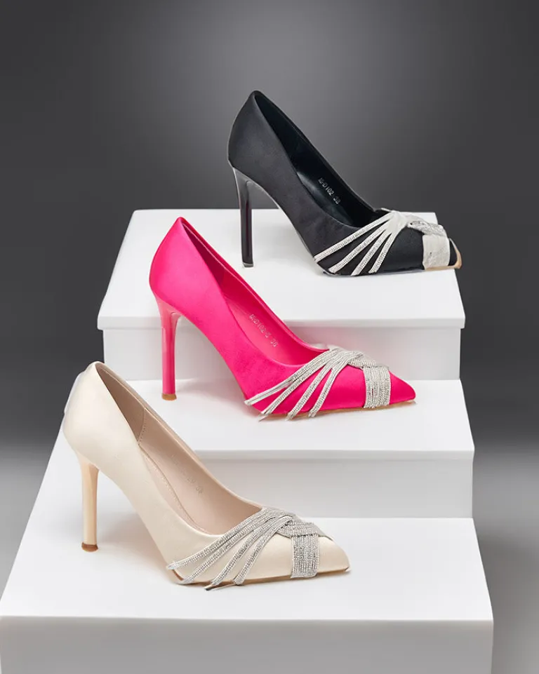 - Przepiękne damskie czółenka na szpilce – połączenie klasyki i elegancji z wygodą! Para wykonana jest z tkaniny a’ la satyna oraz eko skórzanej wkładki . Para zdobiona cyrkonami na szpiczastym nosku. Must have w szafie każdej kobiety!