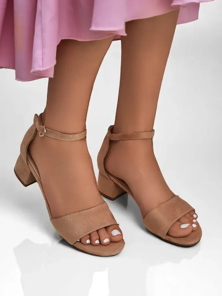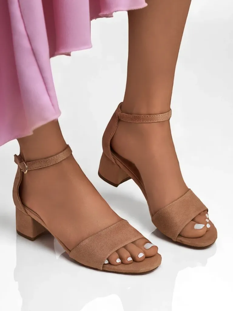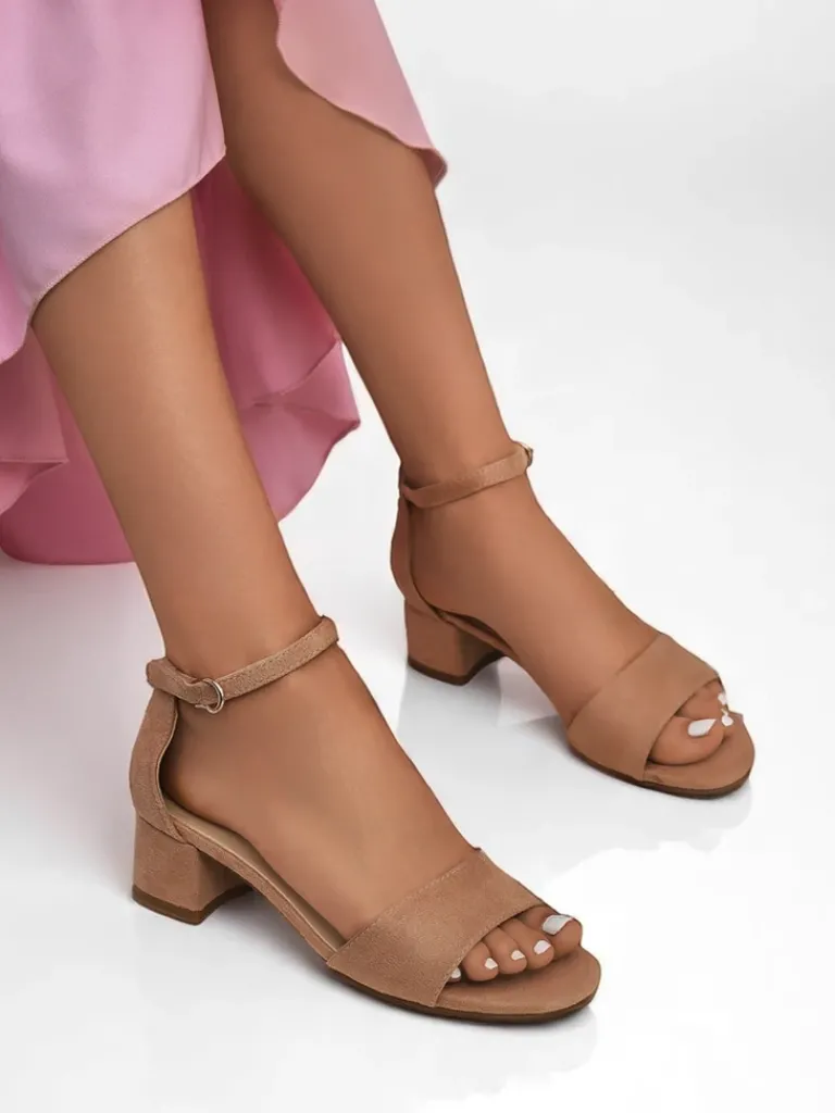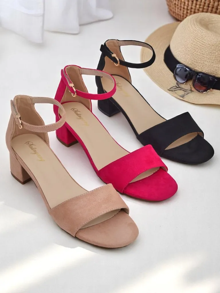 - Sandały na niskim obcasie z eko zamszu, z wygodną wkładką z eko skóry. Zapinane na sprzączkę, idealne na lato – eleganckie, wygodne i lekkie w codziennym noszeniu.
