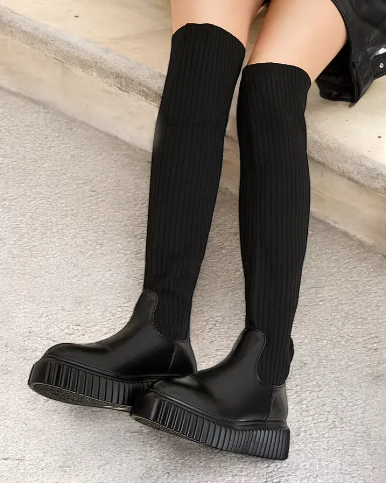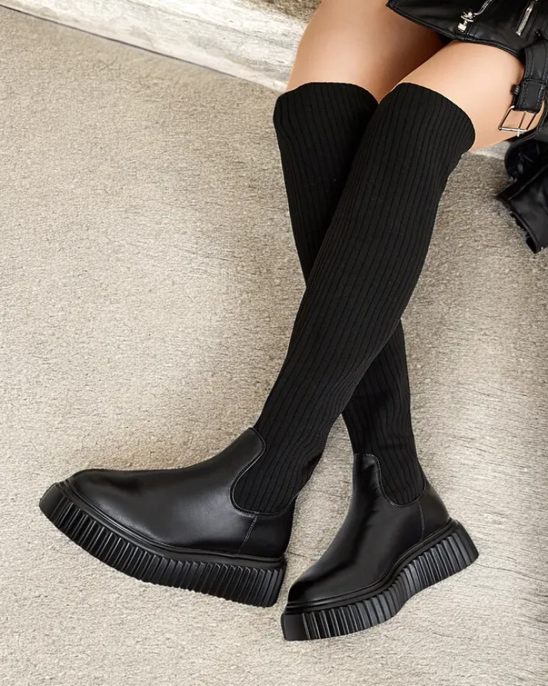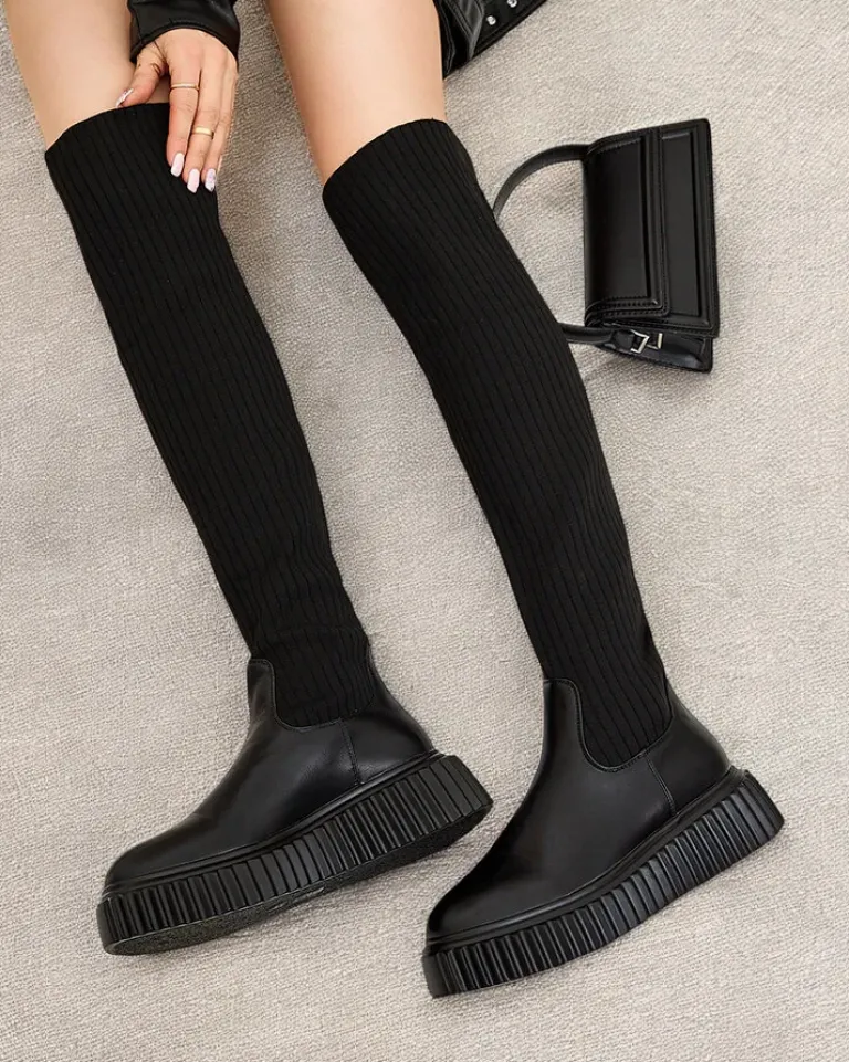 - Stylowe damskie kozaki za kolano na grubszej podeszwie. Cholewka wykonana jest z elastycznego materiału tkaninowego prążkowanego i posiada eko skórzane wstawki. Wkładka futerkowa. Model wsuwany.