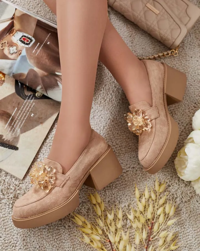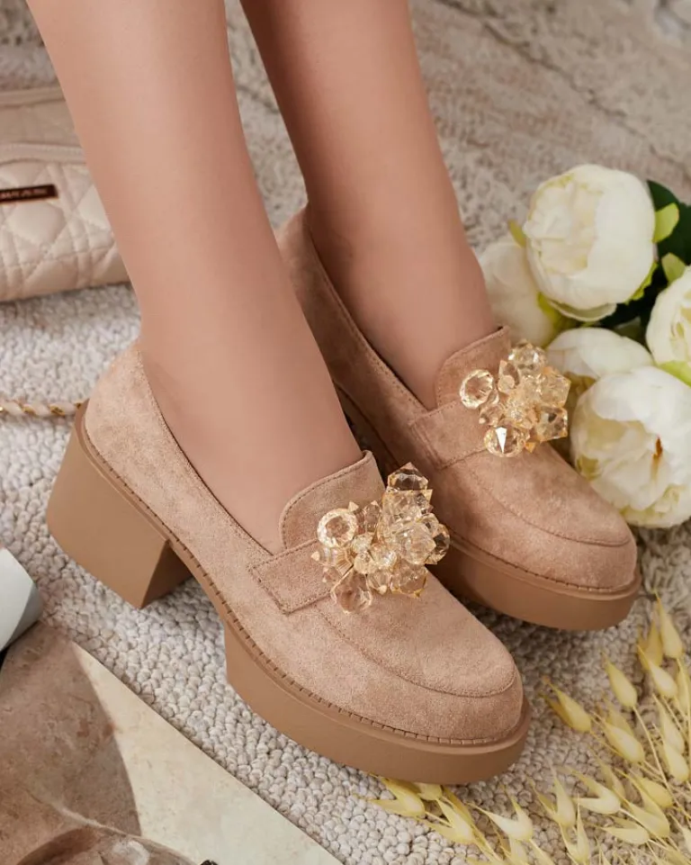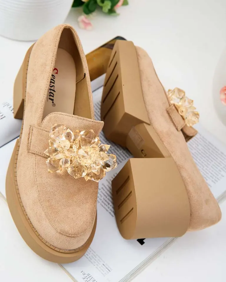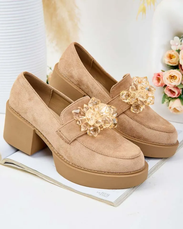 - Przepiękne damskie półbuty typu mokasyny na słupku. Model w tylu casual i jest wykonany ze skóry ekologicznej zamszowej i wkładki z eko skóry. Nosek zaokrąglony, zdobiony kryształkami. Idealna baza dla wielu codziennych looków!