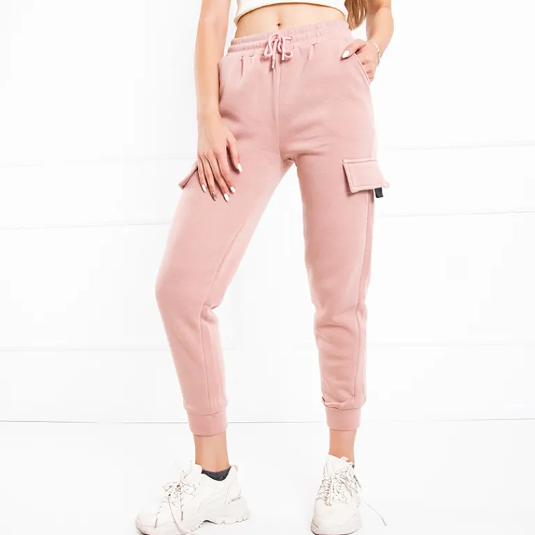 - Damskie ocieplane spodnie dresowe typu cargo z wysokim stanem, wykonane z miękkiej tkaniny bawełnianej. Model z 2 wsuwanymi kiszeniami, posiada elastyczną gumę w talii i na dole nogawek, w pasie wiązane troczki. UWAGA: Dokładność pomiaru (+/-) 1 cm.
