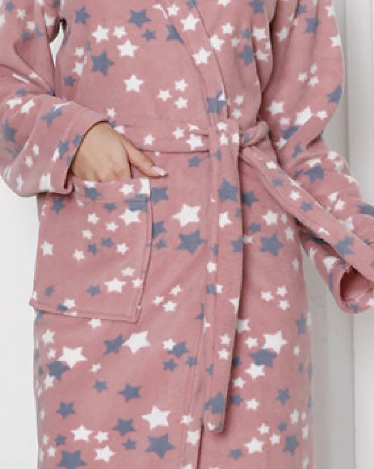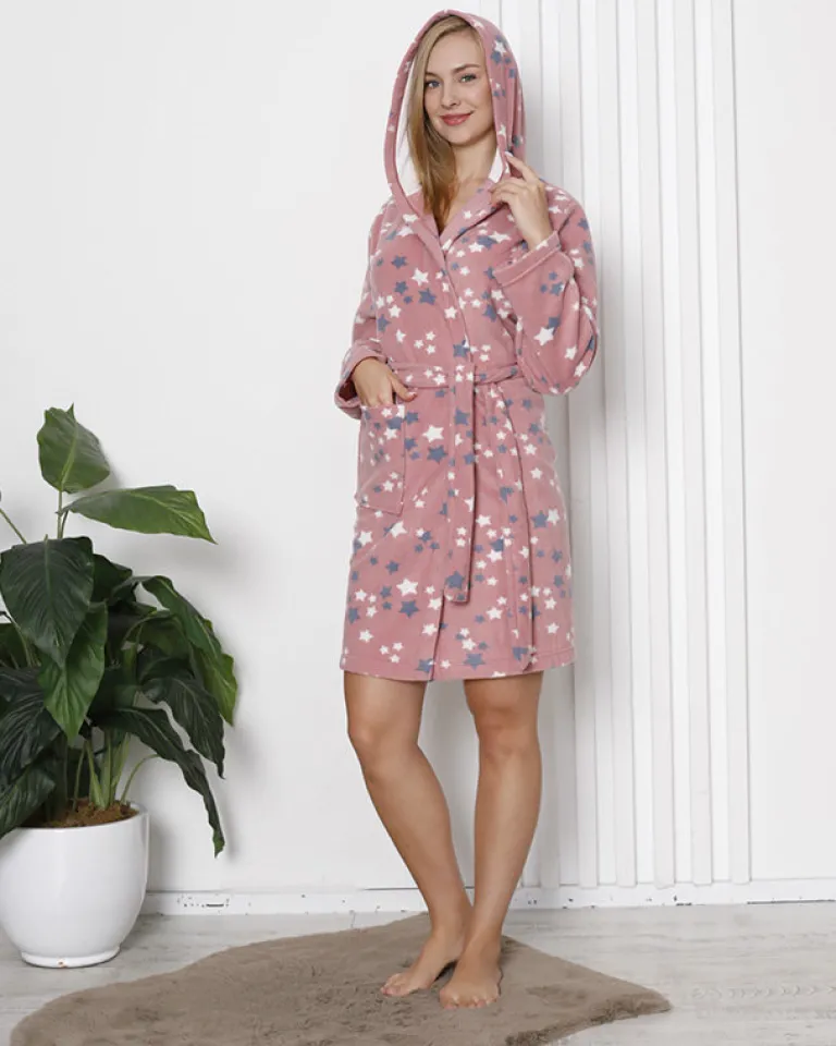 - Szlafrok damski wykonany z materiału bawełnianego z wzorzystym wykończeniem i kapturem. Wygody dodaje duża wsuwana kieszeń po boku i pasek wiązany w talii. Doskonały na zimowe chwile spędzone w domu. UWAGA: Dokładność pomiaru (+/-) 1 cm.