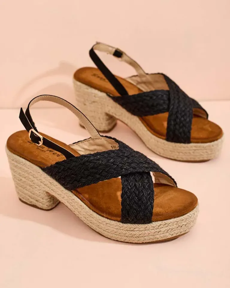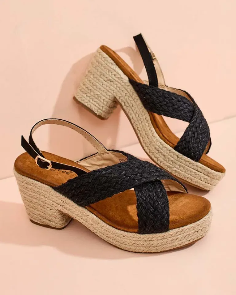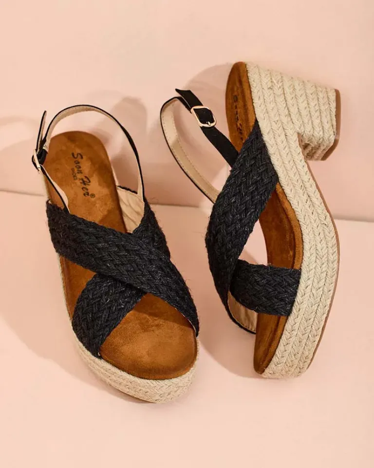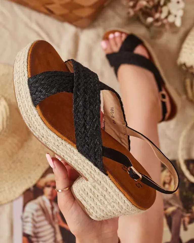 - Sandały na słupku i platformie wykonane z plecionej tkaniny i eko skórzanej wkładki, zapinane na sprzączkę. Model na wygodnym obcasie, zdobiony sznurkiem jutowym. Załóż je do sukienki!
