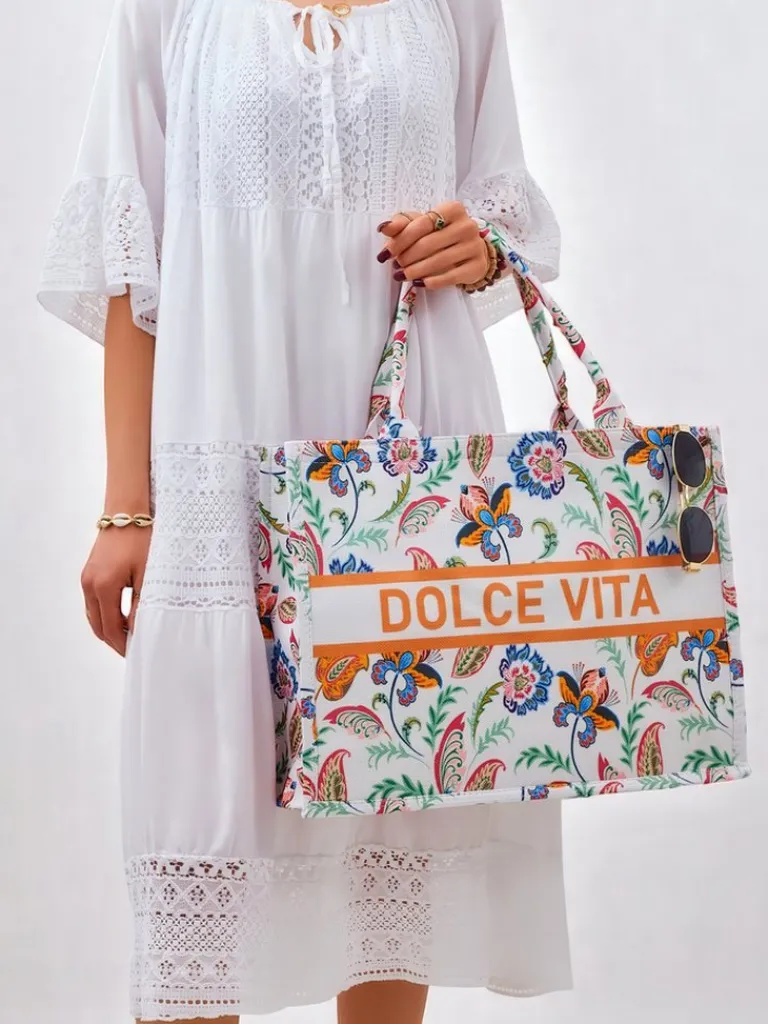- Duża, materiałowa torebka damska z kolorowym, wzorzystym motywem i napisem DOLCE VITA. 1 komora, lekka i pojemna – idealna na lato i stylowe wyjścia!