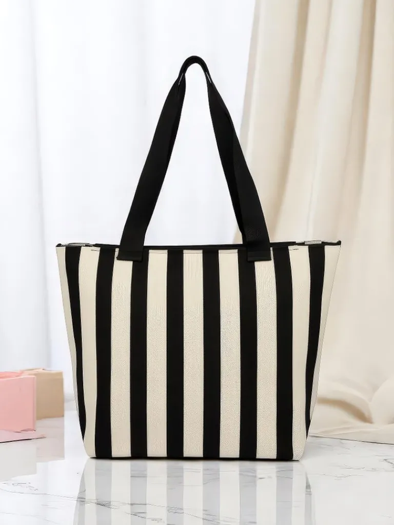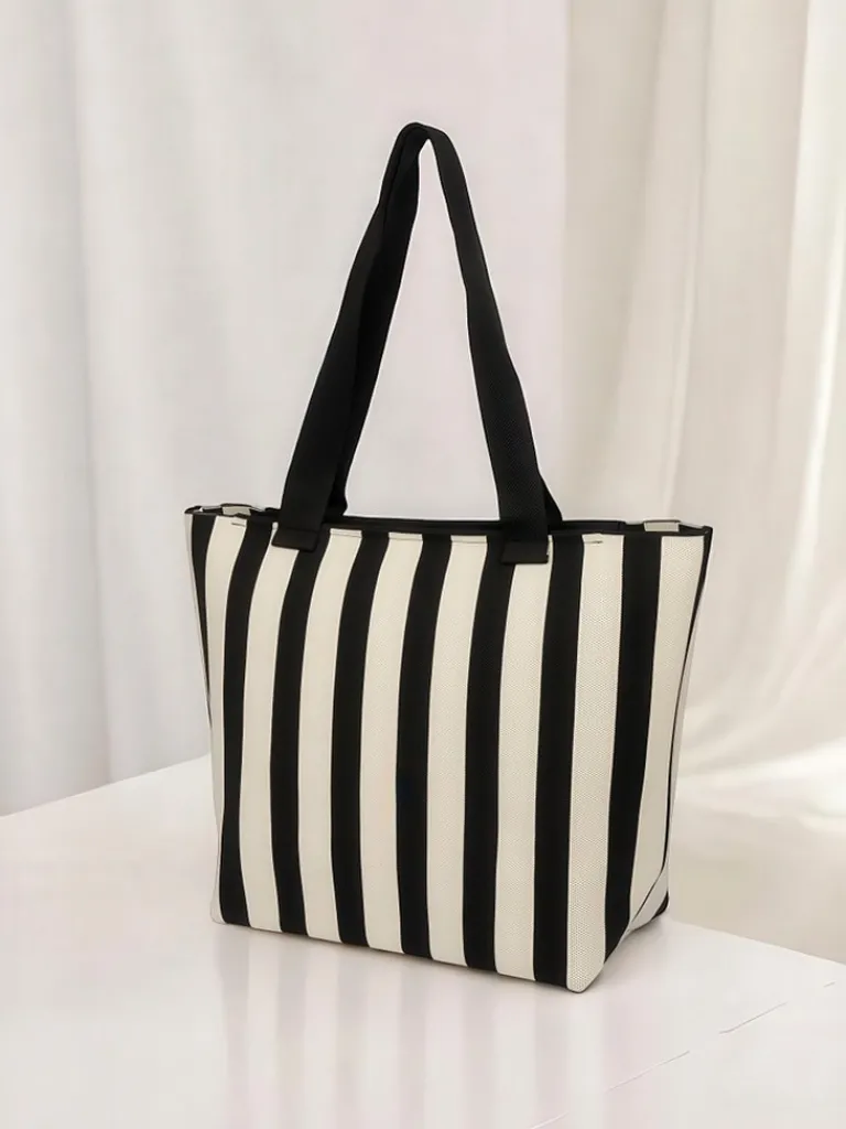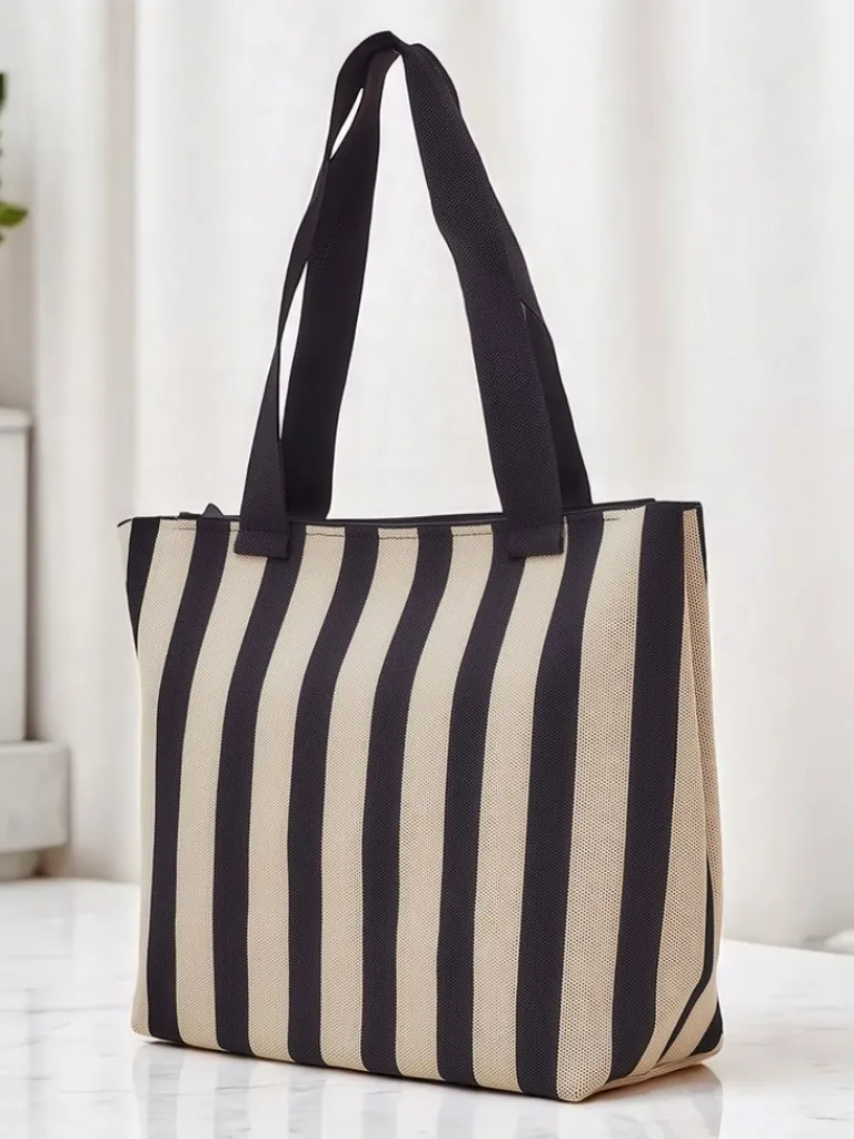 - Duża, materiałowa torebka damska z klasycznym wzorem w paski. 1 komora, zapięcie na zamek. Lekka, pojemna i stylowa – idealna na zakupy i codzienne wyjścia!