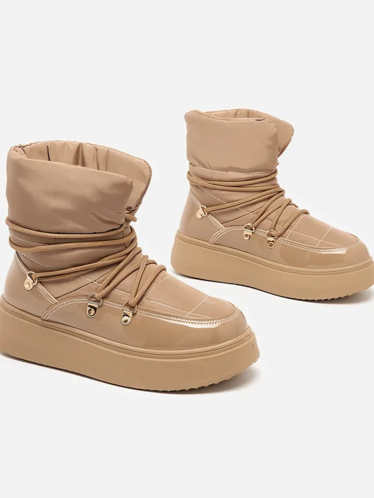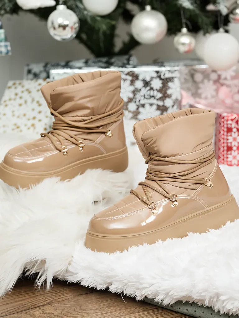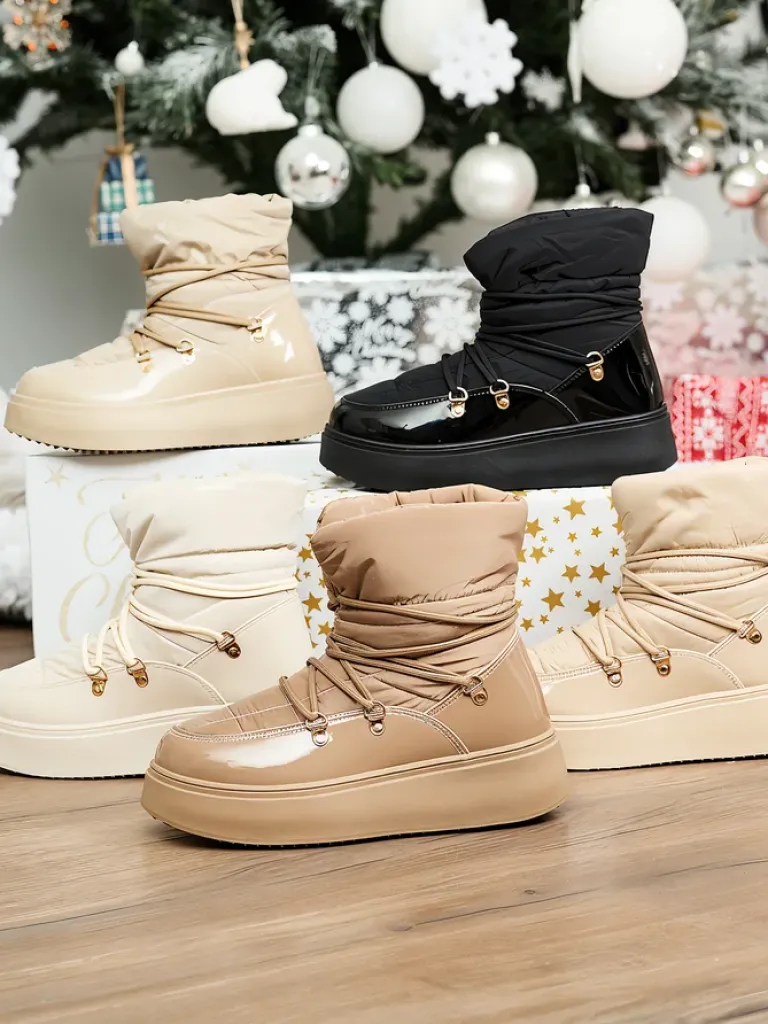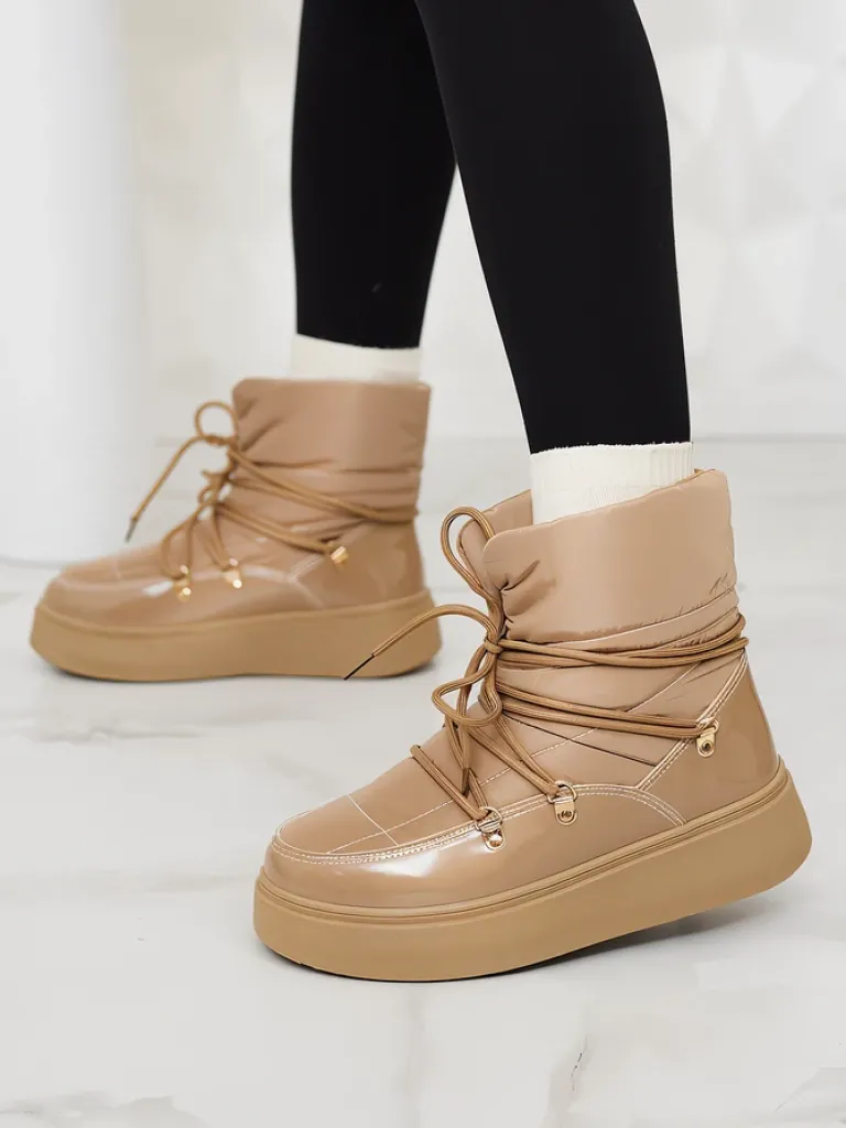- Ponadczasowe damskie obuwie typu śniegowce. Cholewką wykonaną z materiału a’la cerata i wstawkami z lakierowanej skóry ekologicznej. W środku ocieplenie w formie futerka, obuwie sznurowane. Idealne na chłodniejszą porę roku!