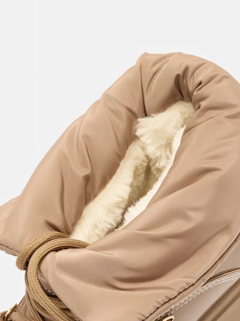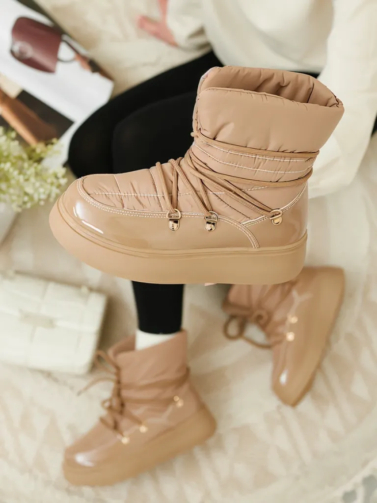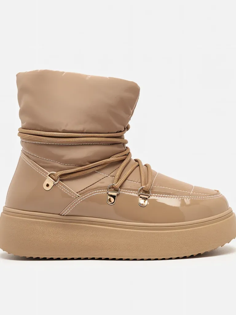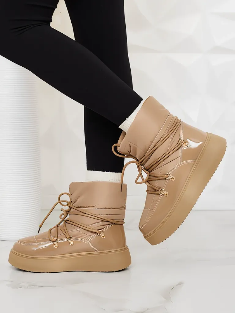 - Ponadczasowe damskie obuwie typu śniegowce. Cholewką wykonaną z materiału a’la cerata i wstawkami z lakierowanej skóry ekologicznej. W środku ocieplenie w formie futerka, obuwie sznurowane. Idealne na chłodniejszą porę roku!