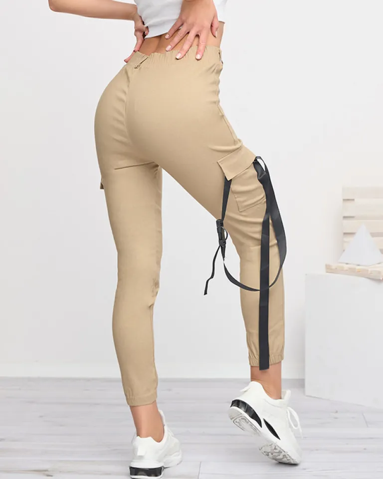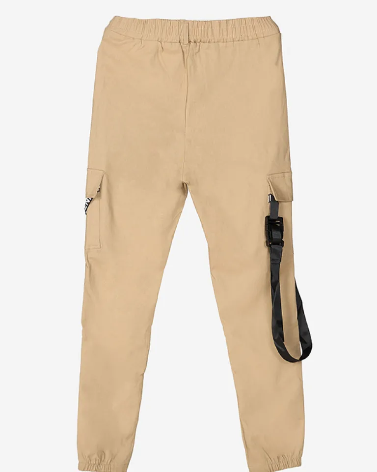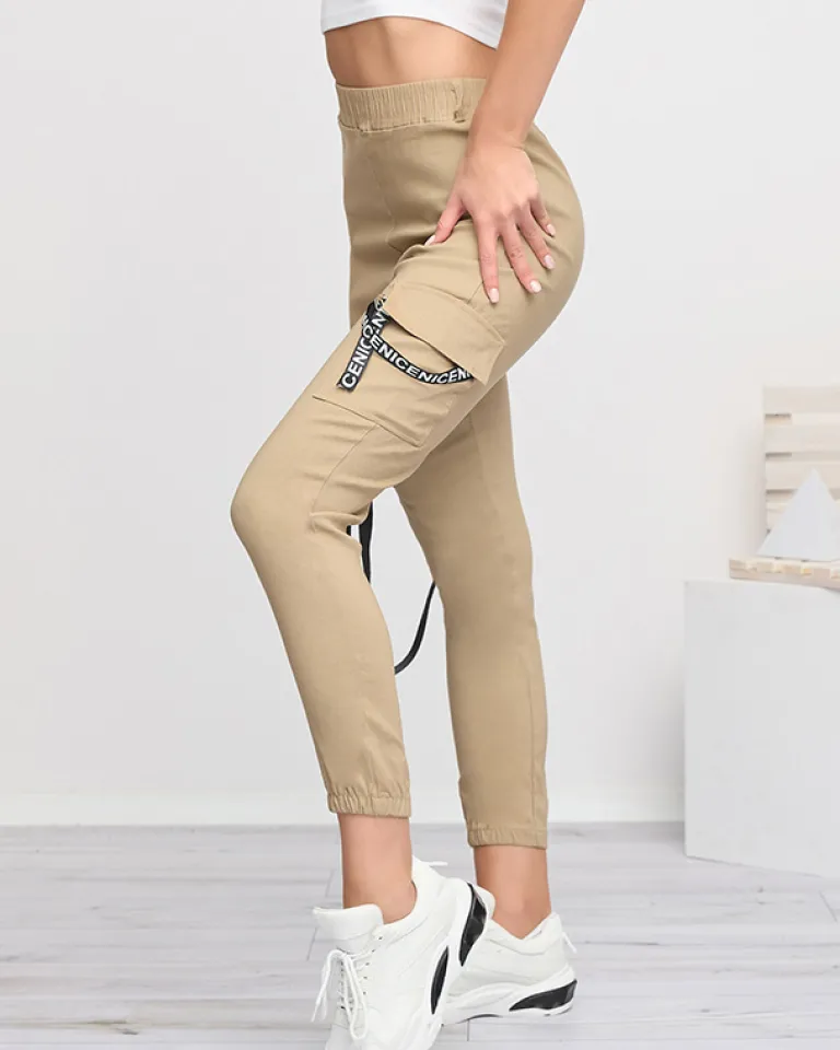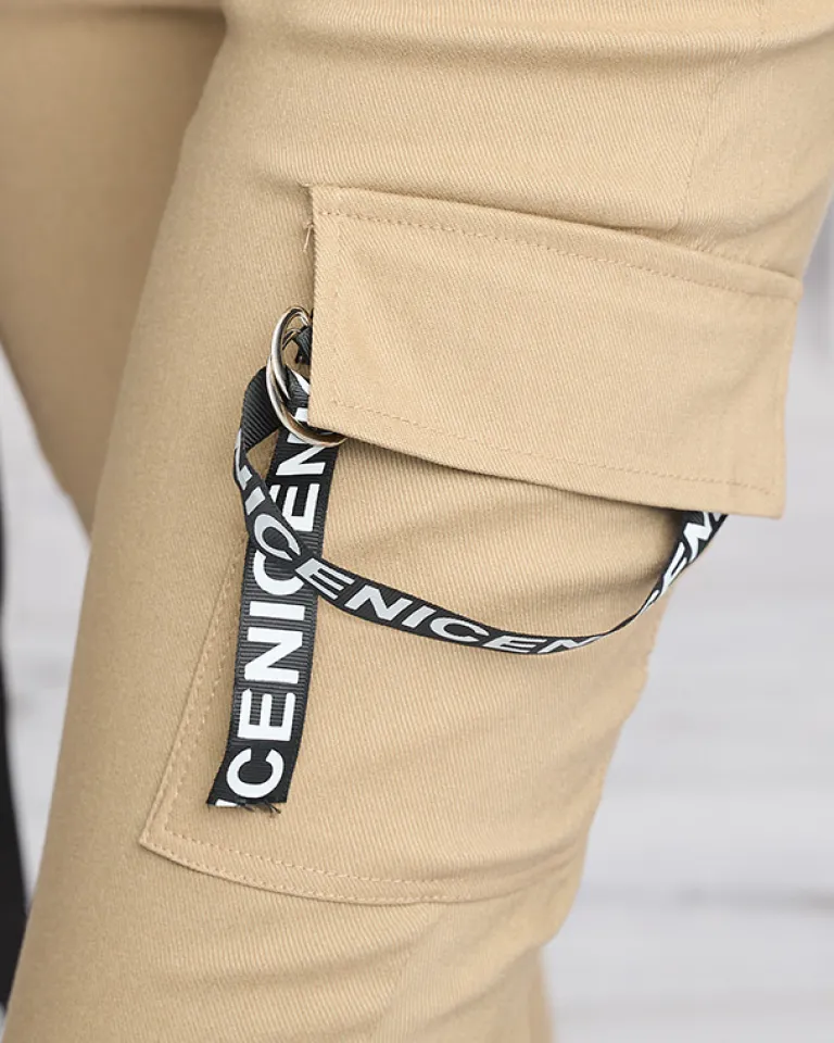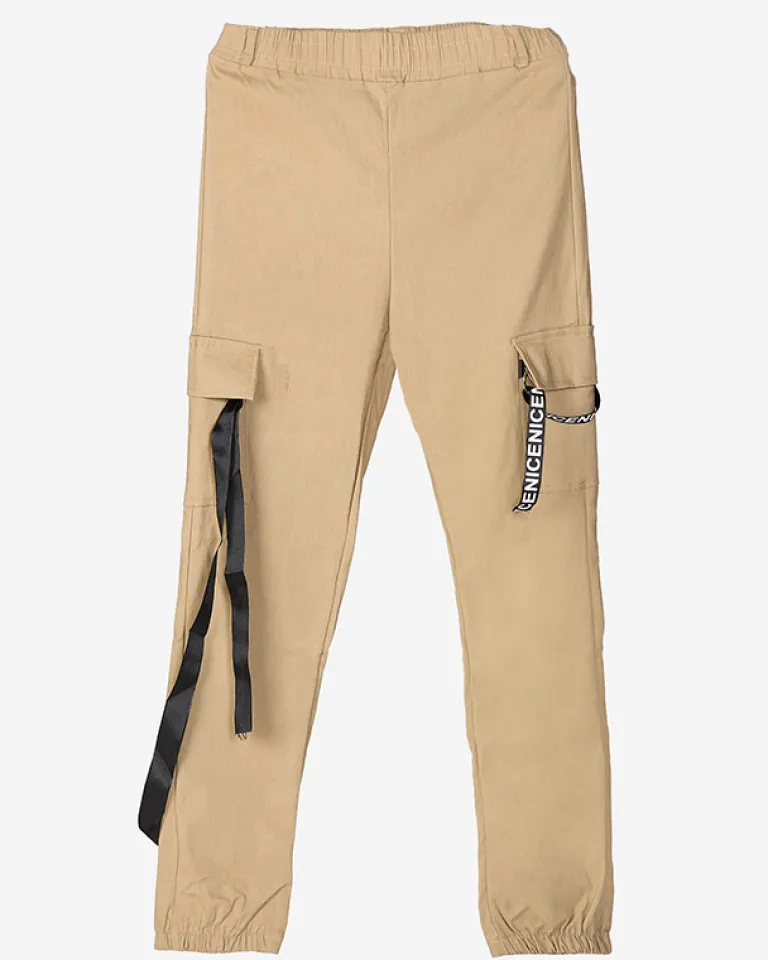 - Stylowe spodnie typu bojówki z ozdobnymi wstążkami, wykonane z tkaniny elastycznej. Model posiada rozciągliwą gumę w pasie i dwie kieszenie. Dodatkowo w zestawie pasek. Idealna baza dla wielu letnich outfitów! UWAGA: Dokładność pomiaru (+/-) 1 cm.