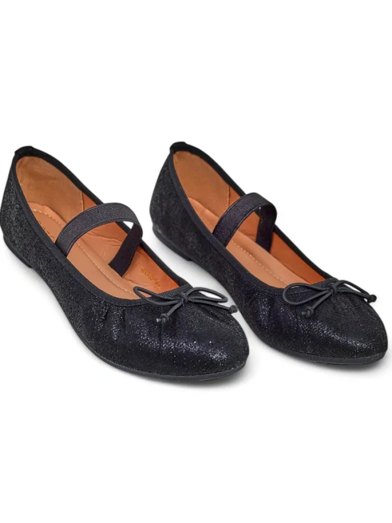 - Wyjątkowe baleriny wykonane z eko skóry zamszowej z okrągłym noskiem i połyskującą nicią. Cholewka zdobiona subtelną kokardką. Miękka eko-skórzana wkładka dostarczy komfortu, a gumka utrzyma obuwie idelnie na stopie!