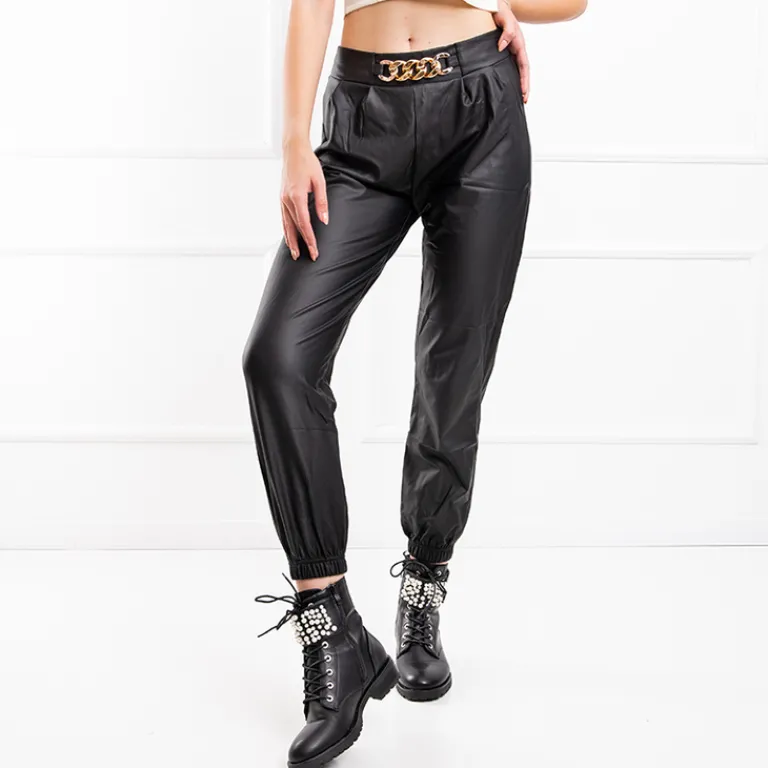 - Spodnie z eko-skóry, ocieplone od środka polarem. Luźne nogawki zakończone ściągaczem. W pasie i z tyłu gumka, a z przodu wszyty szeroki złoty łańcuch. UWAGA: Dokładność pomiaru (+/-) 1 cm.