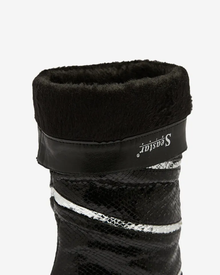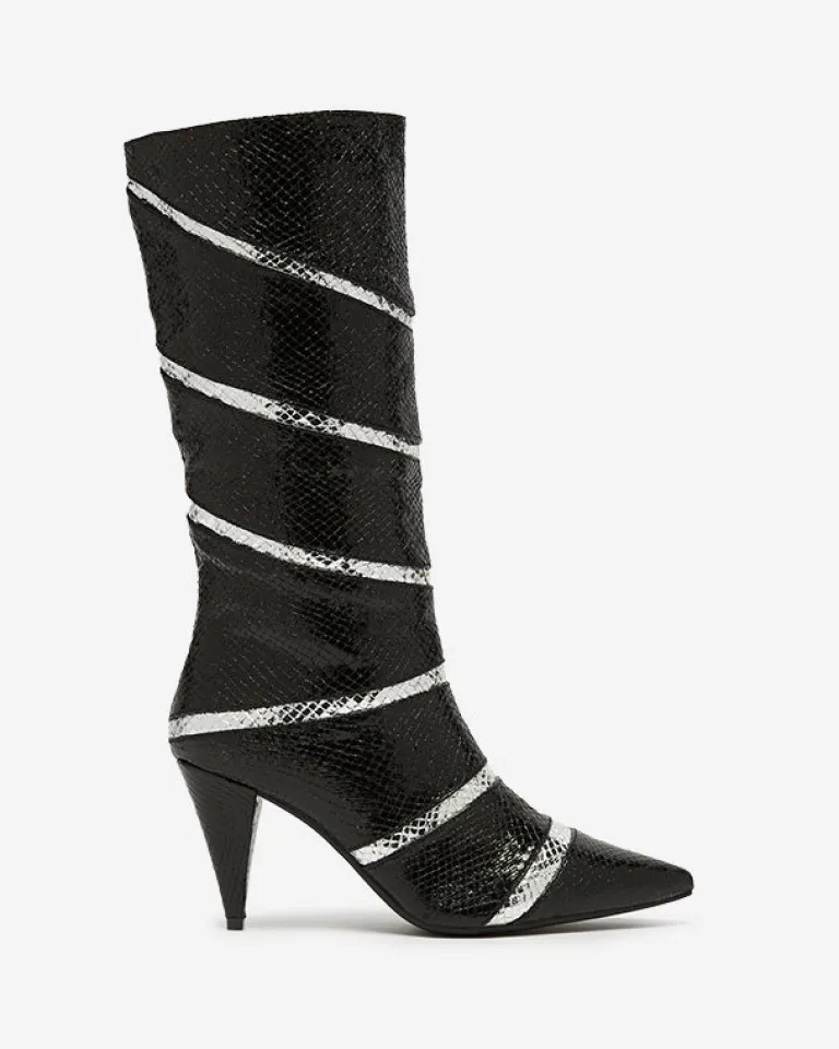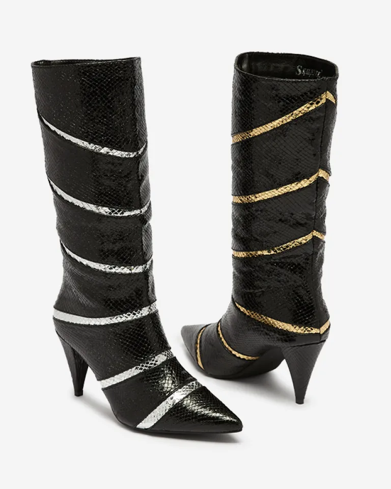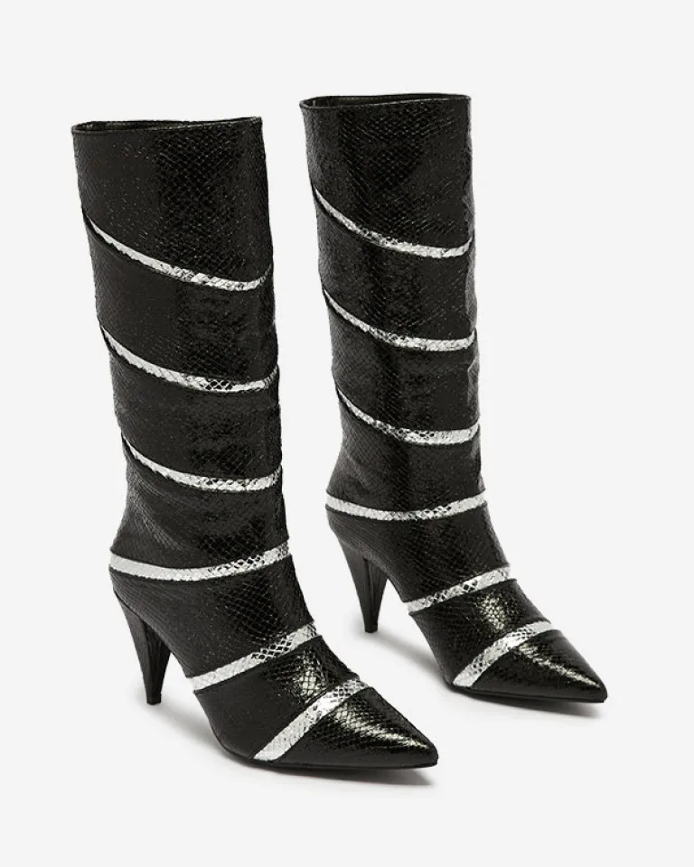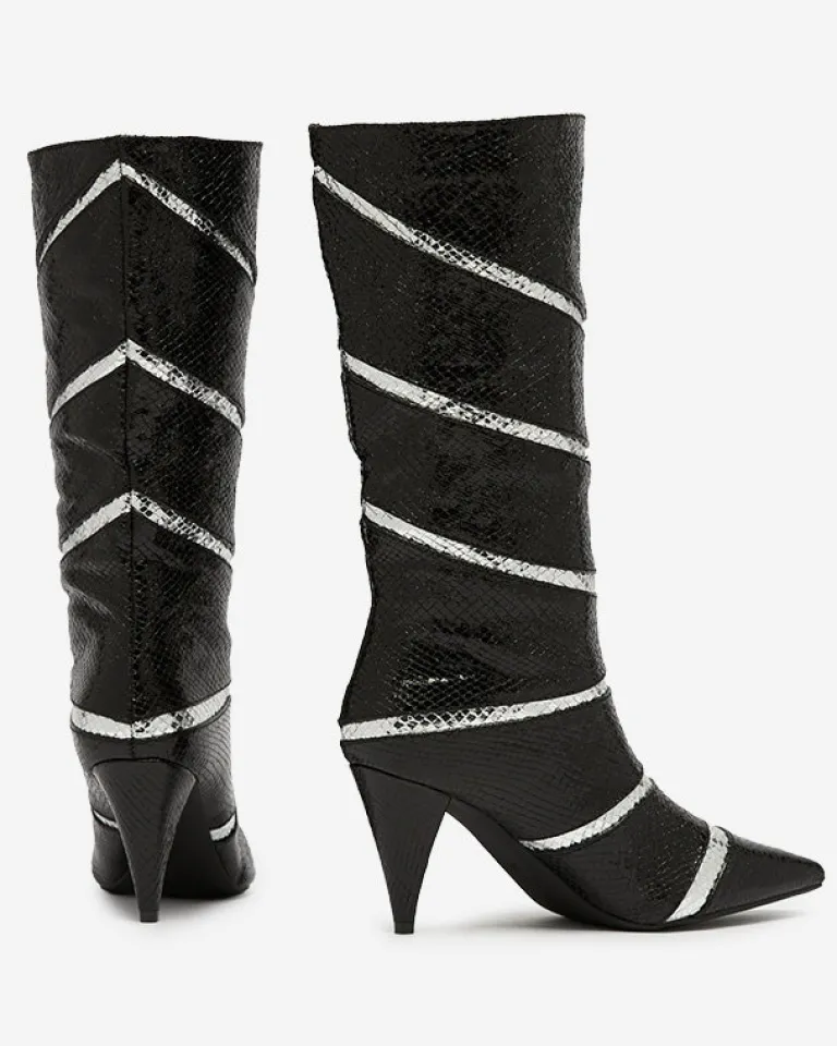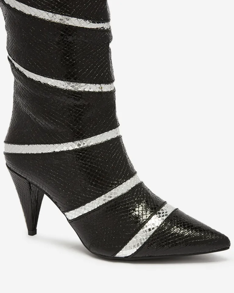 Online Czarno- srebrne damskie kozaki na szpilce z tłoczeniem w paski Felifea Kozaki Na Obcasie|Kozaki Z Ociepleniem