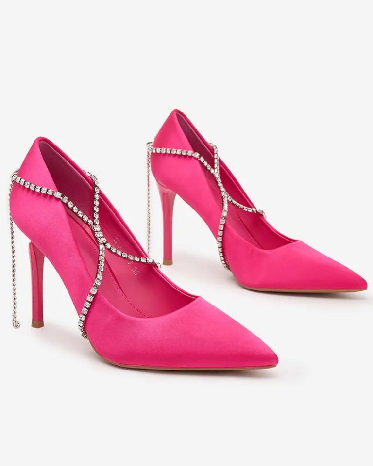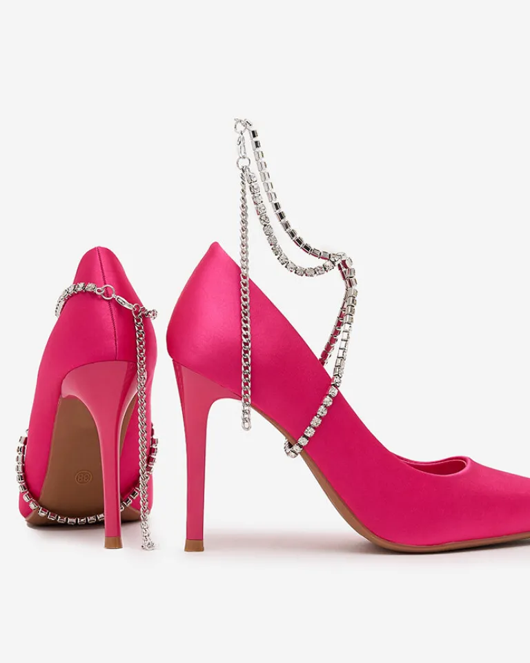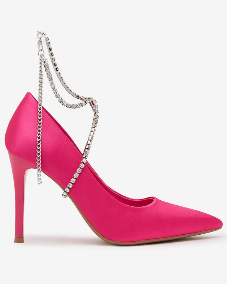 - Przepiękne damskie czółenka na sszpilce – połączenie klasyki i elegancji z wygodą! Para wykonana jest z tkaniny a’ la satyna oraz eko skórzanej wkladki. Model posiada zdejmowaną ozdobę z cyrkonii. Must have w szafie każdej kobiety!