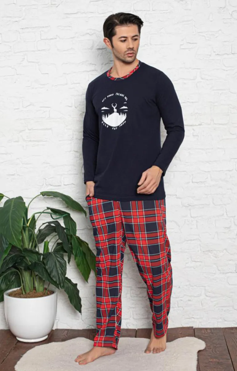 - Elegancka granatowa piżama męska z unikalnym nadrukiem i czerwonymi spodniami w kratę. Wykonana z wysokiej jakości bawełny, gwarantuje komfortowy sen i stylowy wygląd. UWAGA: Dokładność pomiaru (+/-) 1 cm.