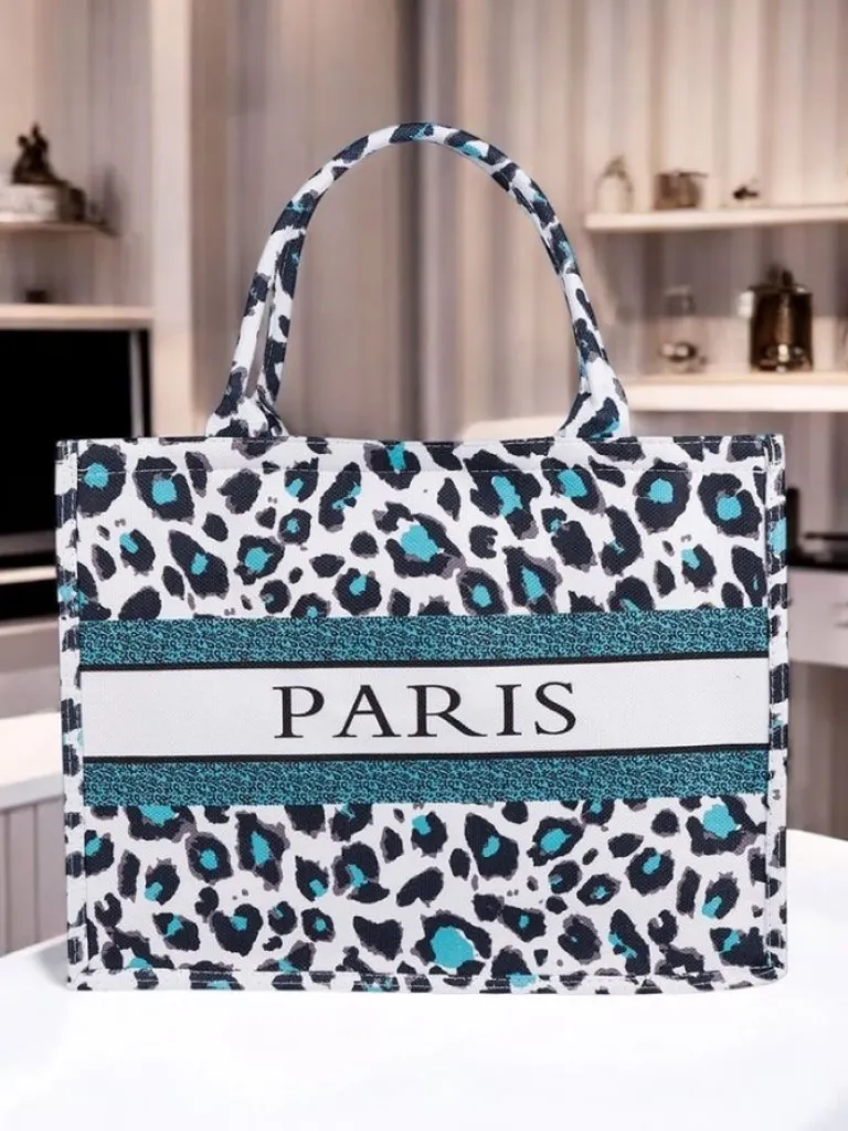 - Duża, materiałowa torebka damska z motywem leo i napisem PARIS. 1 komora, lekka i pojemna. Idealna na co dzień, zakupy i wiosenno-letnie stylizacje!