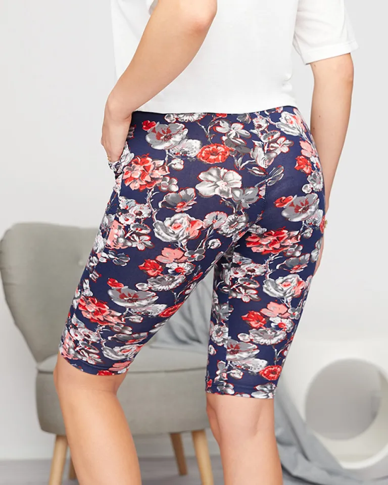 - Wygodne damskie spodenki z kieszeniami, wykonane z tkaniny bawełnianej w kwiaty. Model o długości 3/4, posiada gumę oraz wiązane toczki w pasie. UWAGA: Dokładność pomiaru (+/-) 1 cm.