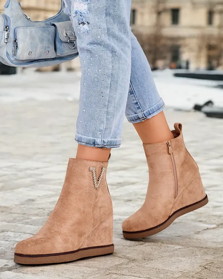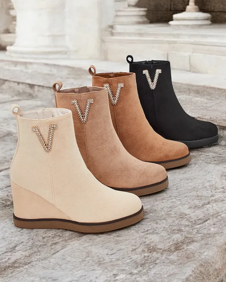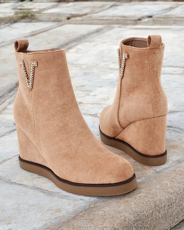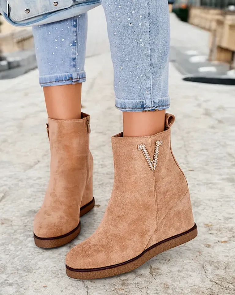 - Eleganckie damskie botki na koturnie, wykonane z eko-zamszu. Obuwie wypełnione od środka futerkiem. Idealny wybór na jesień!