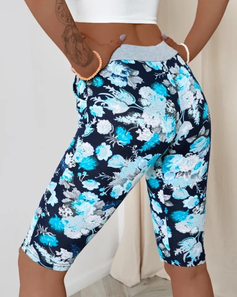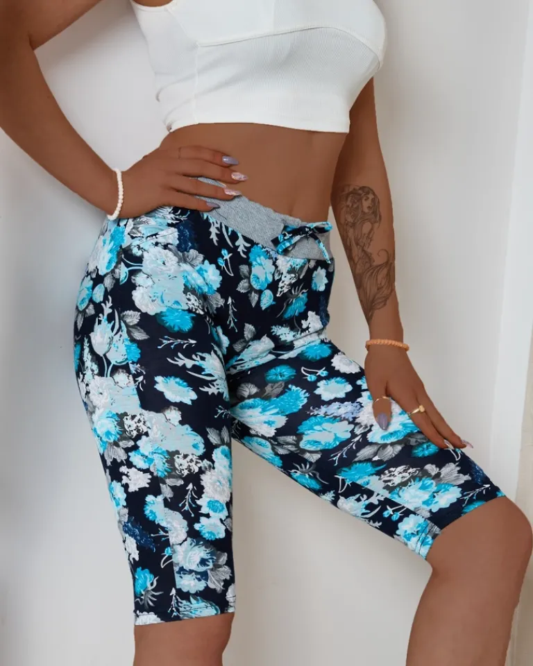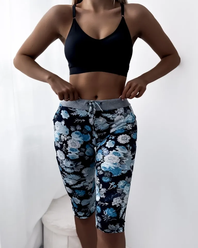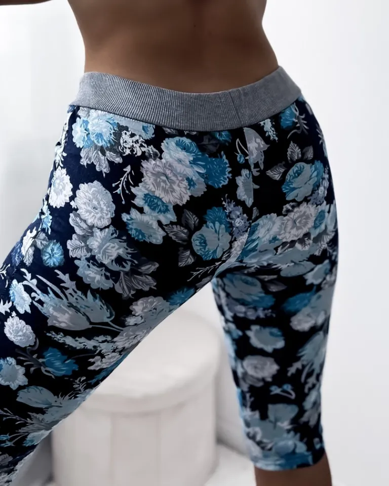 Outlet Ciemnoniebieskie damskie spodenki 3/4 z kwiatowym wzorem Spodenki 3/4|Krótkie Spodenki