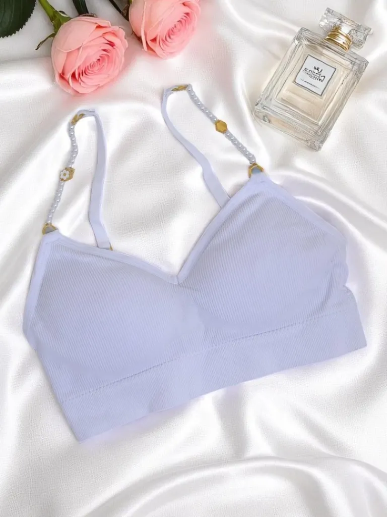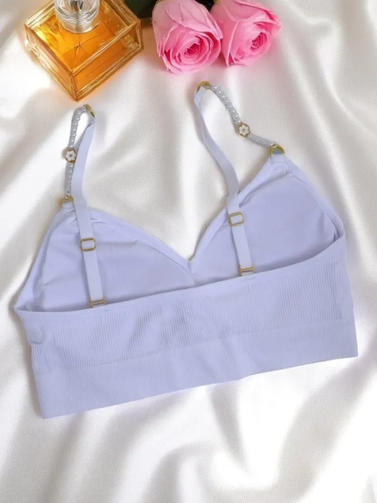 - Damski usztywniany biustonosz sportowy z ozdobnymi, regulowanymi ramiączkami, bez zapięcia. Wkładki wyjmowane. Prążkowany materiał łączy styl z wygodą – idealny na trening i co dzień.
