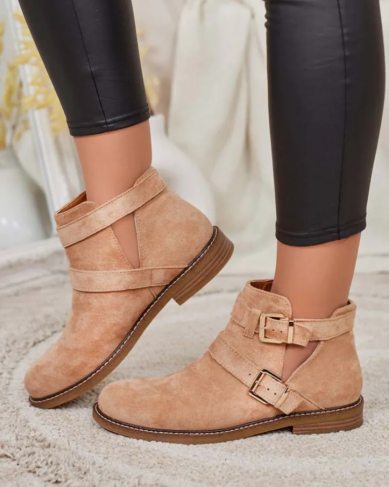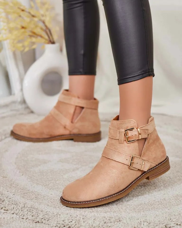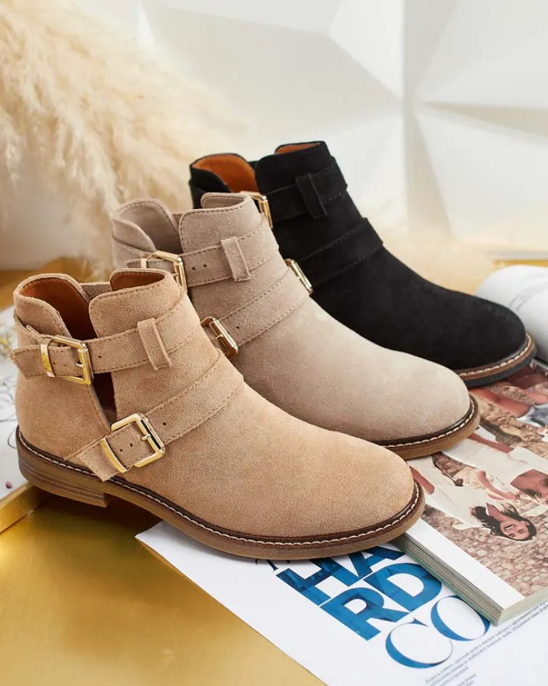 - Damskie botki z wycięciami na płaskim obcasie, wykonane z eko-zamszu. Środek wyłożony skórą naturalną, model wsuwany. Idealne na wiosnę!