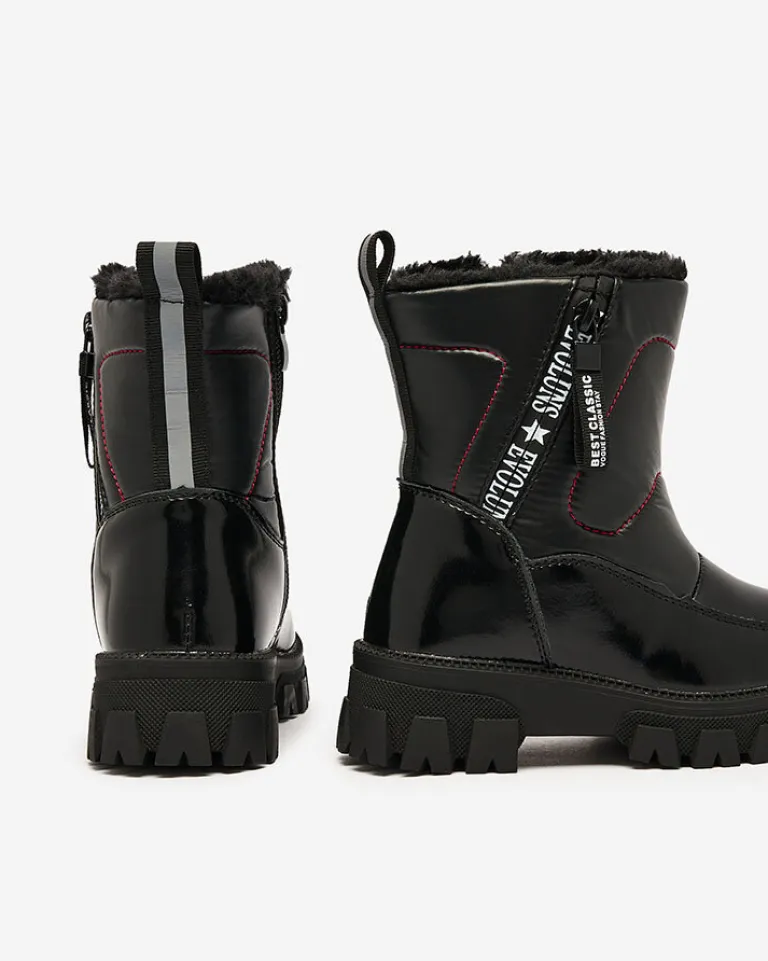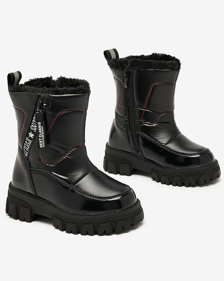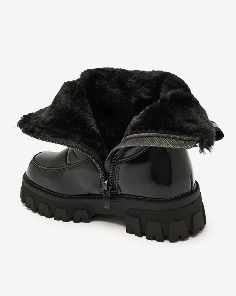- Wyjątkowe dziecięce obuwie typu śniegowce. Cholewka jest wykonana ze skóry ekologicznej lakierowanej oraz materiału sztucznego a’la cerata. Środek jest ocieplony grubym futerkiem. Obuwie zasuwane na suwak.