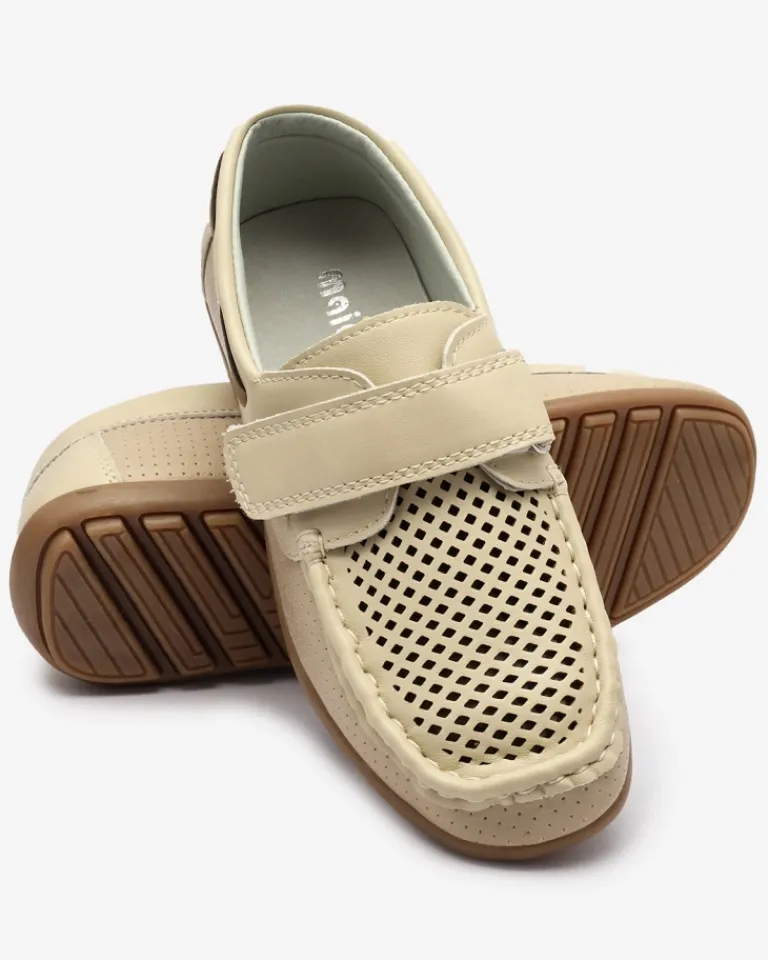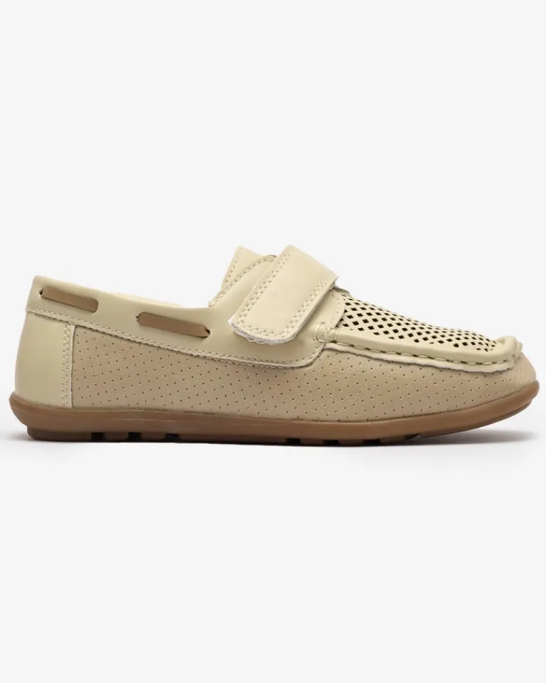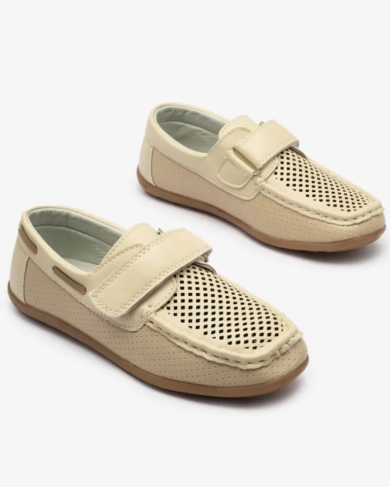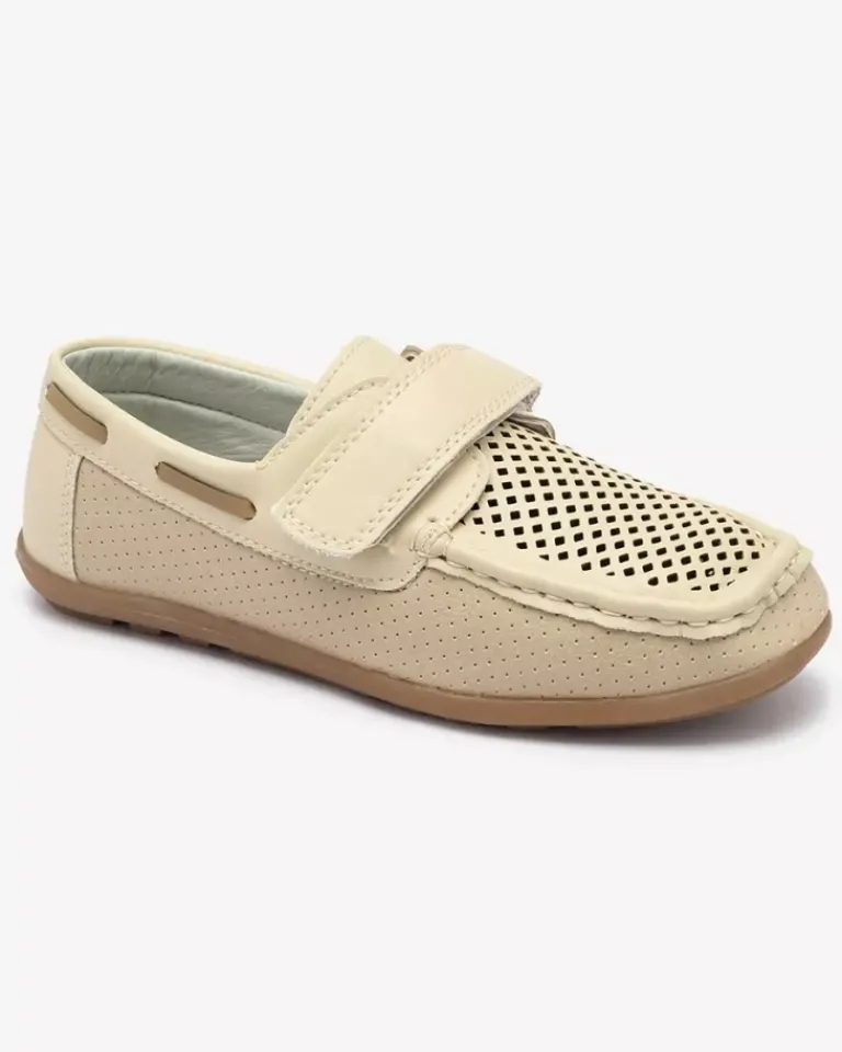 - Ażurowe dziecięce mokasyny wykonane ze skóry ekologicznej z wkładką ze skóry naturalnej. Cholewka z ażurowym wykończeniem, posiada zapięcie na rzep. Idealne na spacer!