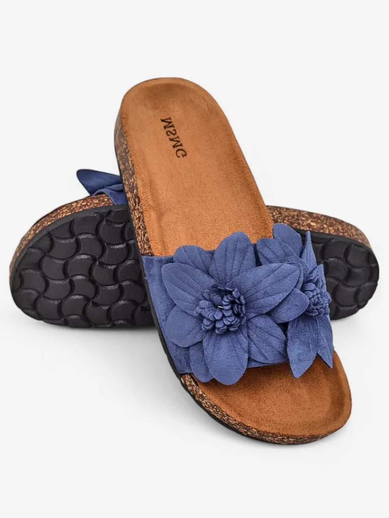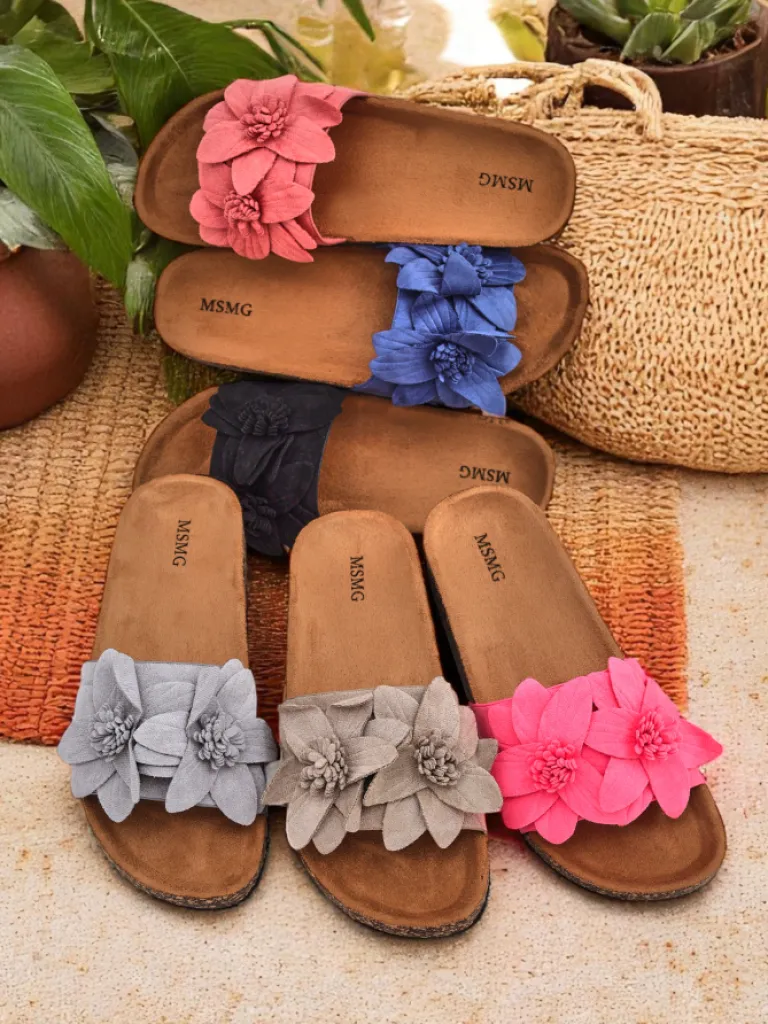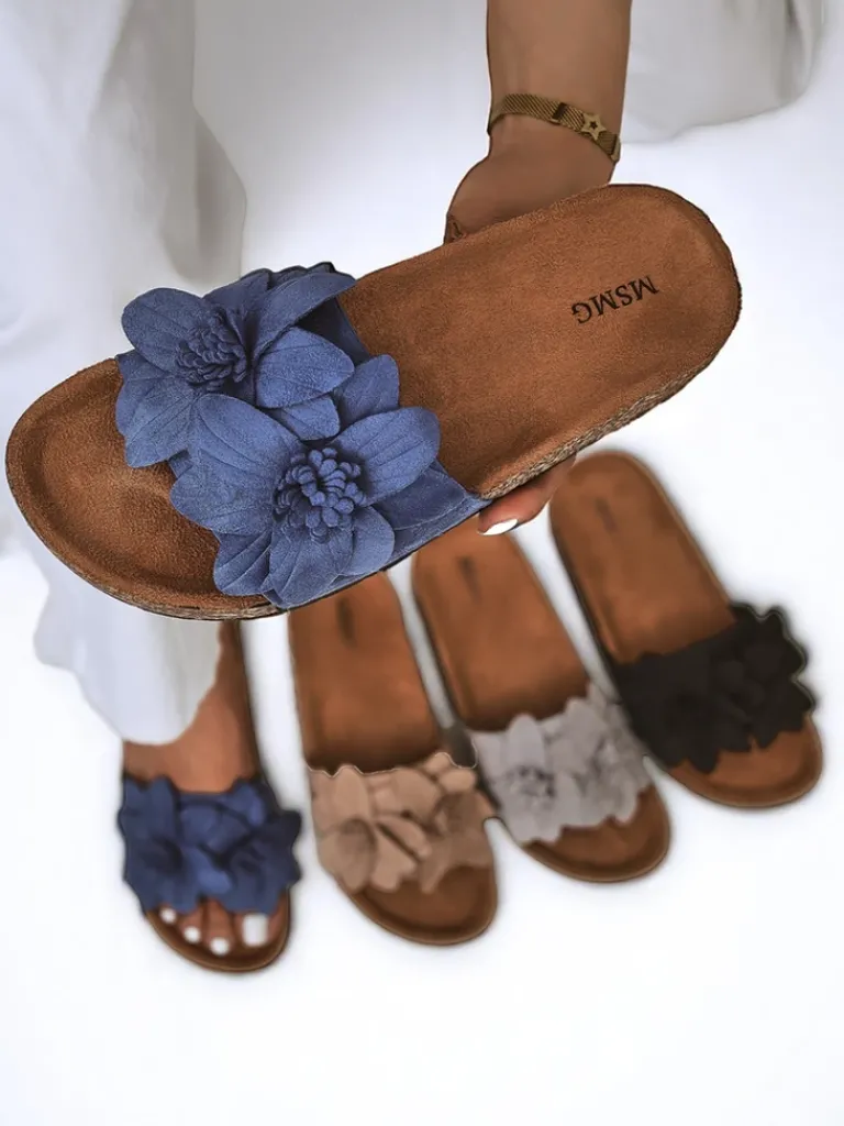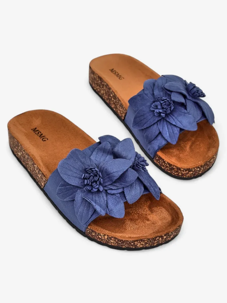 - Przepiękne klapki damskie wykonane ze skóry ekologicznej zamszowej, zdobione kwiatuszkami. Gumowa podeszwa zdobiona materiałem a’la korek. Model w ciekawej kolorystyce. Idealnie uzupełnią letnie stylizacje!