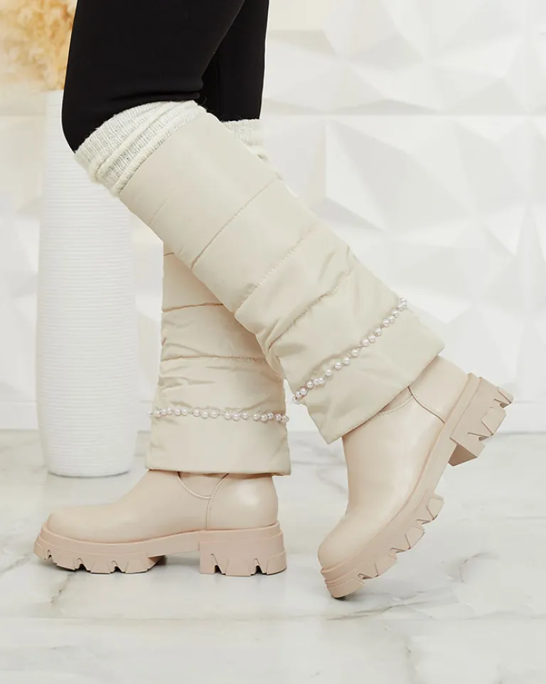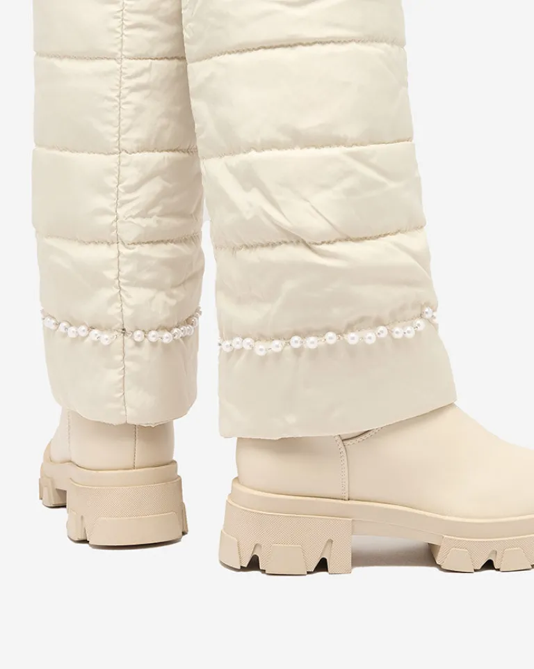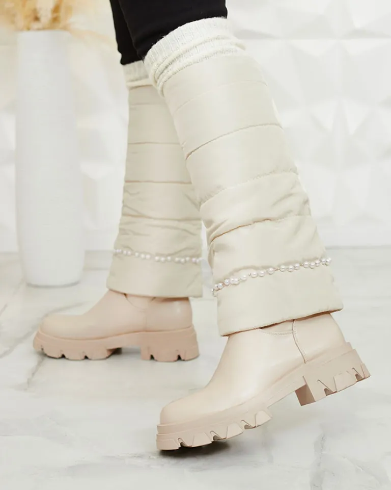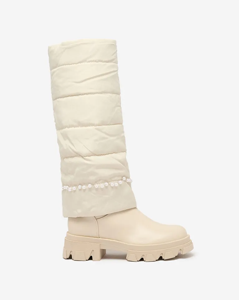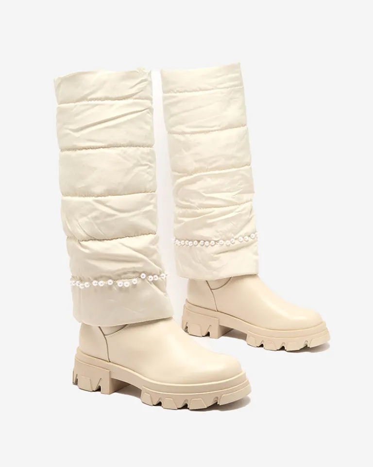- Damskie wsuwane kozaki na płaskim obcasie. Wykonane ze skóry ekologicznej, pokryte tkaninowym materiałem z zewnątrz, w środku ocieplone futerkiem. Model zdobiony subtelnym łańcuszkiem z perełek. Idealny wybór do zimowych stylizacji!