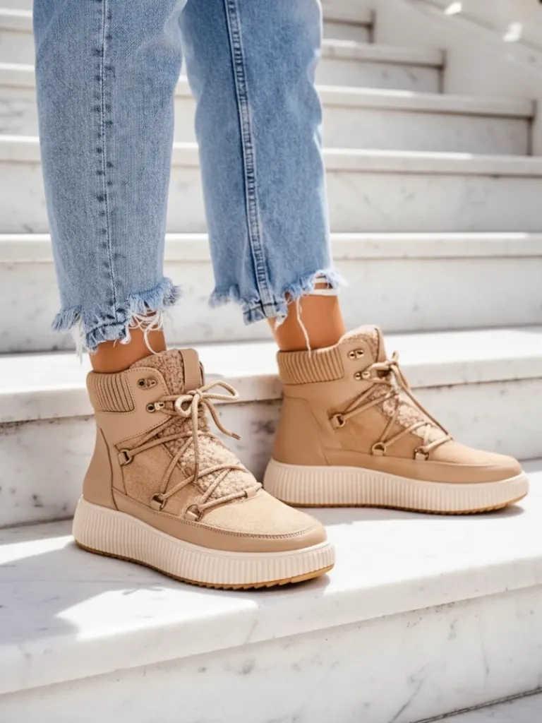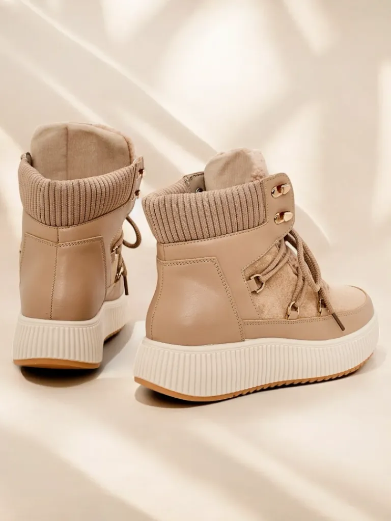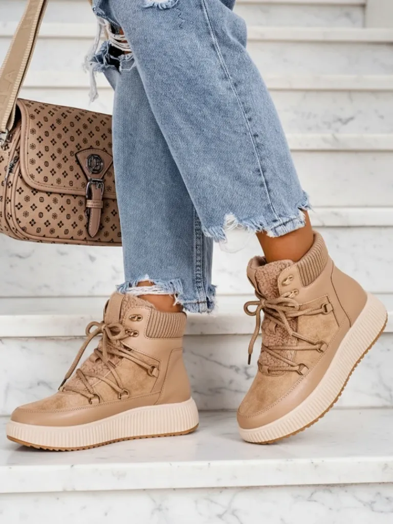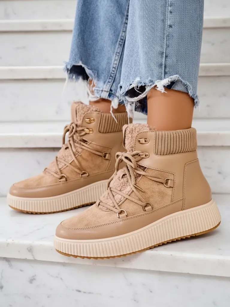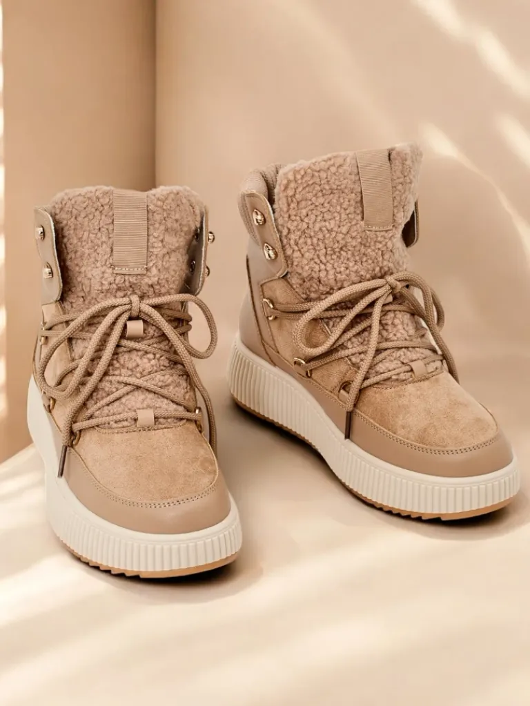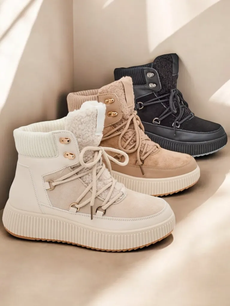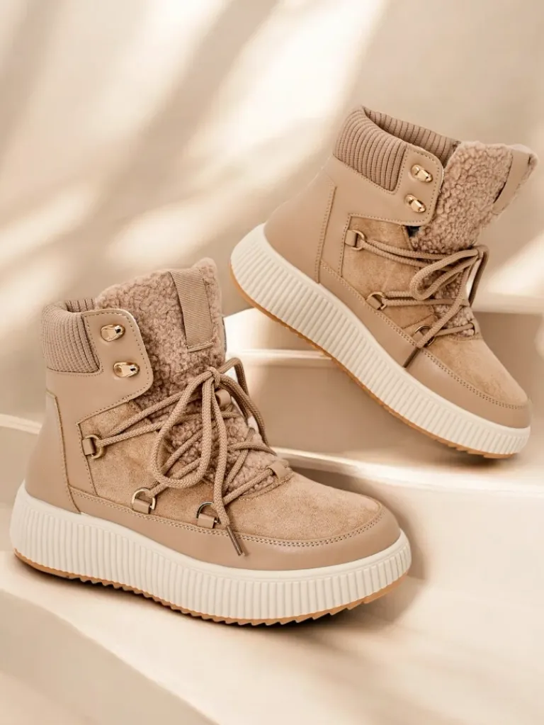 - Ponadczasowe damskie obuwie typu śniegowce na grubej podeszwie. Cholewka wykonana ze skóry ekologicznej i eko zamszu. W środku ocieplenie w formie futerka, obuwie sznurowane. Idealne na chłodniejszą porę roku!