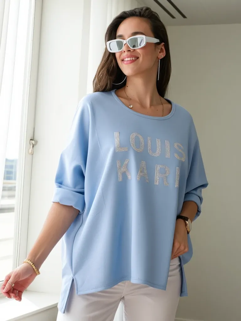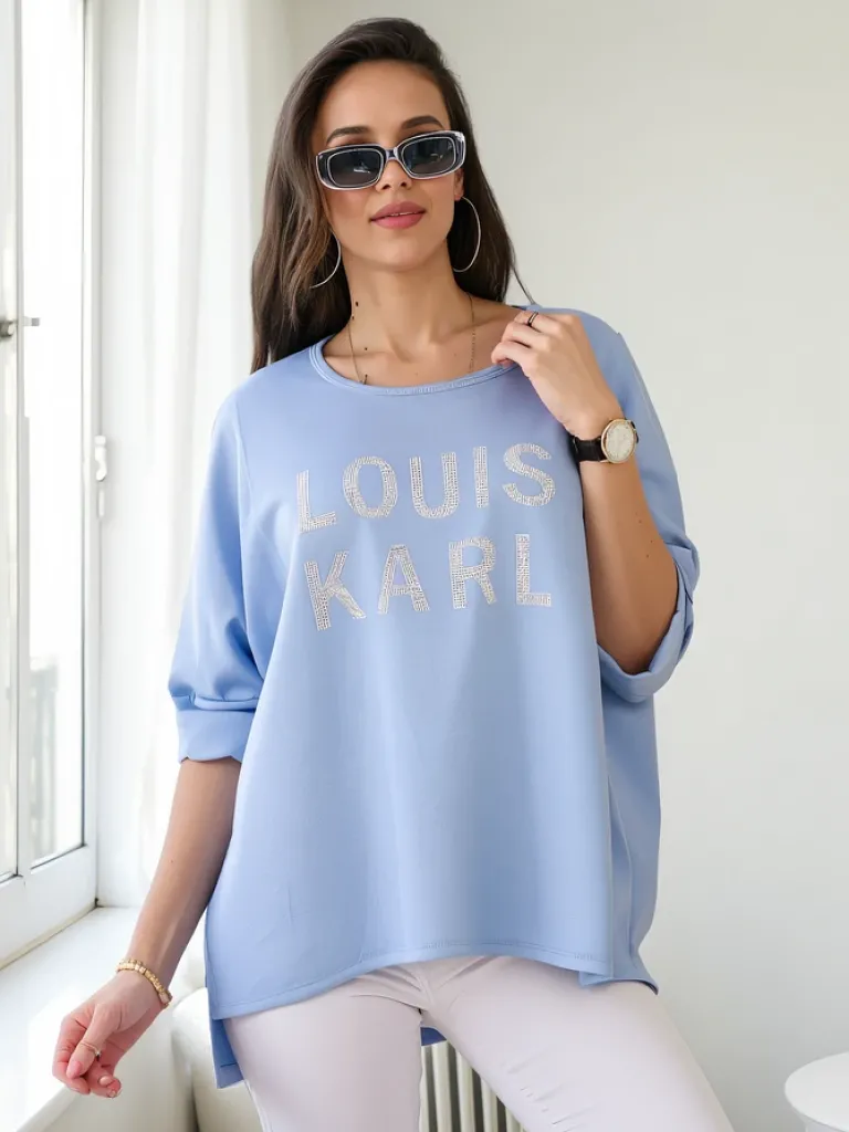 - Oryginalna damska bluzka z okrągłym dekoltem, uszyta z miękkiej i przyjemnej w dotyku tkaniny. Całość zdobiona subtelnym napisem z cyrkonii, a długi rękaw dodaje lekkości. Doskonały wybór do tworzenia modnych i stylowych zestawów!
