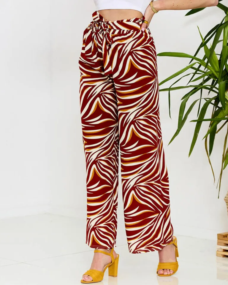 - Wzorzyste szerokie spodnie damskie. Model wykonany z lekkiej i zwiewnej tkaniny, posiada gumę oraz wiązanie podkreślające talię. Idealna baza do stylowych outfitów na wiosnę! UWAGA: Dokładność pomiaru (+/-) 1 cm.