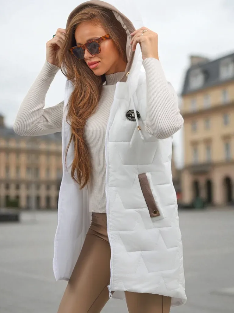 - Rewelacyjna pikowana długa kamizelka damska. Bezrękawnik zapinany suwakiem, posiada kaptur i 2 kieszenie. Produkt z wypełnieniem syntetycznym. Świetne dopełnienie jesiennych stylizacji! UWAGA: Dokładność pomiaru (+/-) 1 cm.