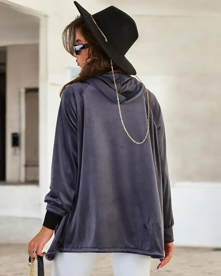 - Klasyczna damska bluza a’la welur zapinana na suwak. Model posiada kaptur, dwie kieszenie oraz ściągacze na dole i przy rękawach. Idealna dla każdej kobiety! UWAGA: Dokładność pomiaru (+/-) 1 cm.