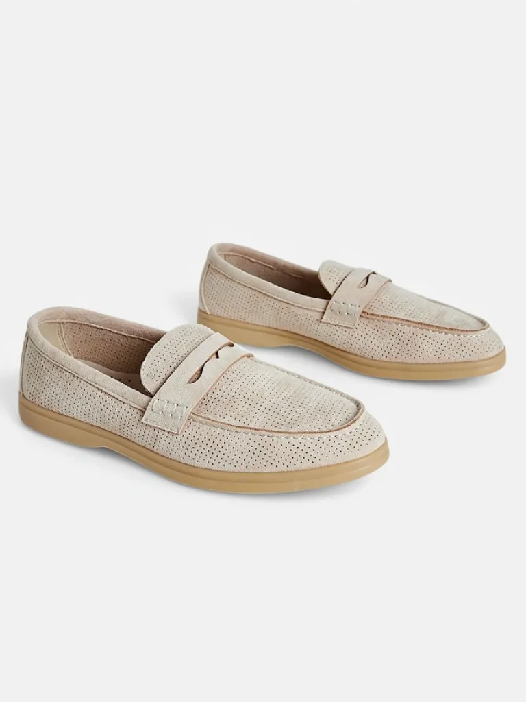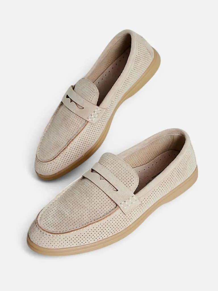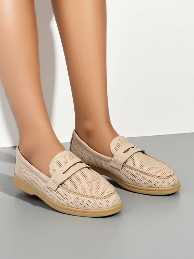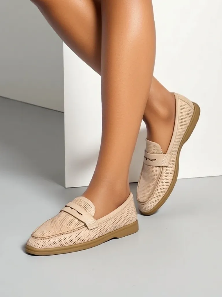 - Ażurowe damskie mokasyny na płaskiej podeszwie. Model wykonany ze skóry ekologicznej zamszowej z wypełnieniem ze skóry naturalnej. Idealny dodatek do codziennych outfitów!