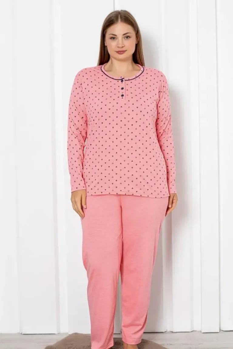 - Damska 2-częściowa piżama wykonana z tkaniny bawełnianej wykończonej ozdobnym printem. Komplet posiada bluzkę z długimi rękawami i guzikami oraz spodnie z gumą w pasie i prostymi nogawkami.