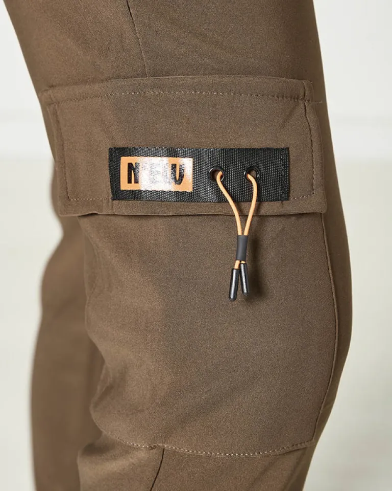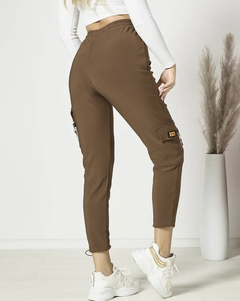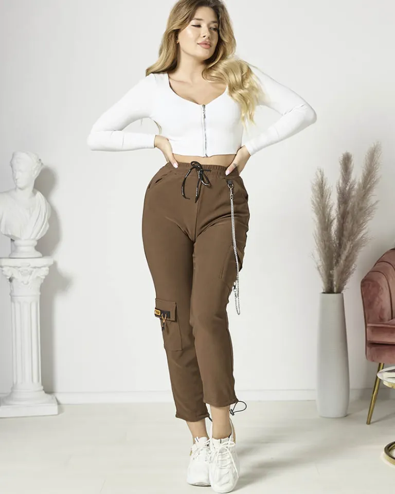 - Rewelacyjne damskie materiałowe spodnie typu bojówki, wykonane z rozciągliwego materiału. Model posiada gumę oraz troczki w pasie i 4 wsuwane kieszenie. Dodatkowo ozdobny, odpinany łańcuszek. Idealne do sneakersów! Dokładność pomiaru (+/-) 1 cm.