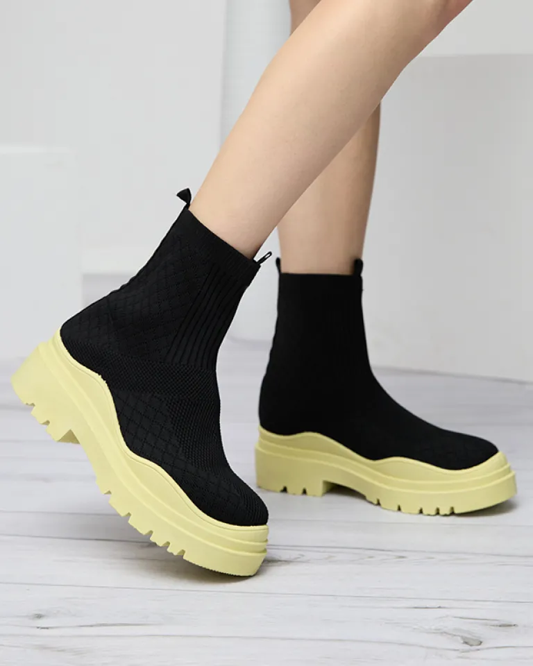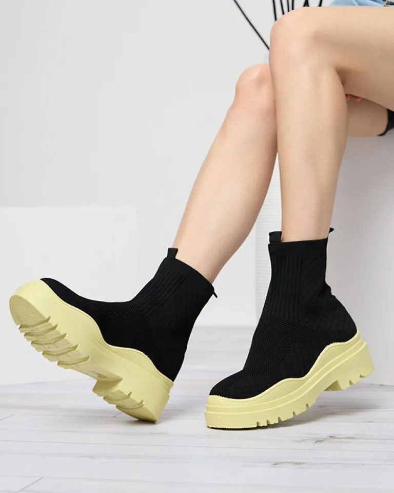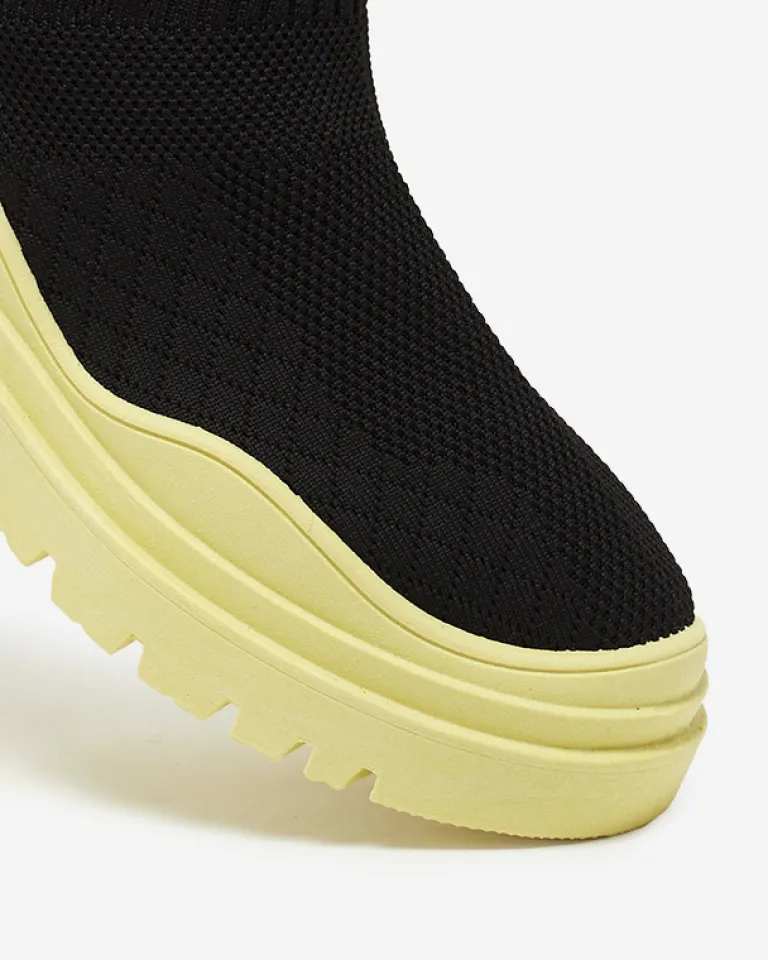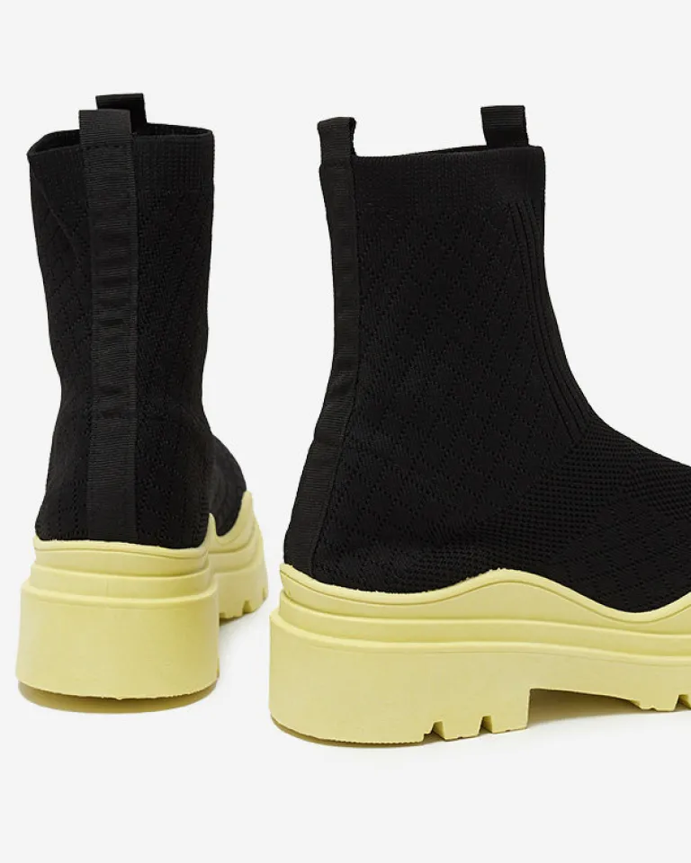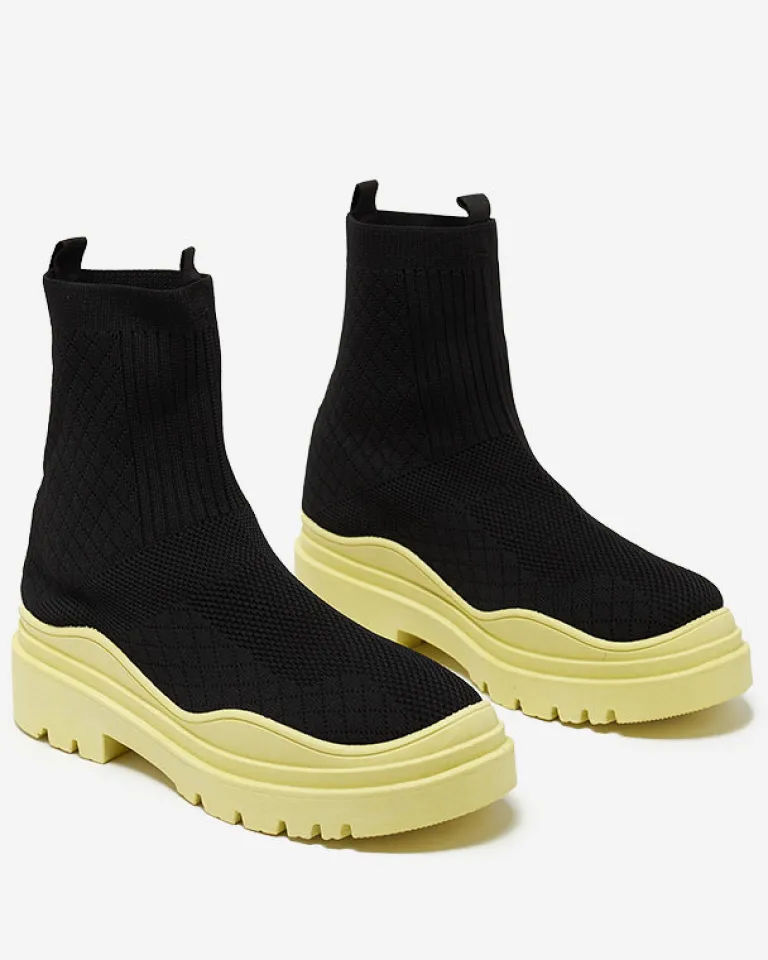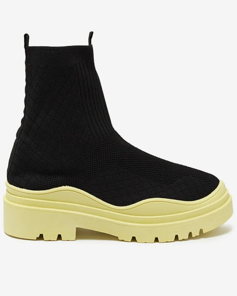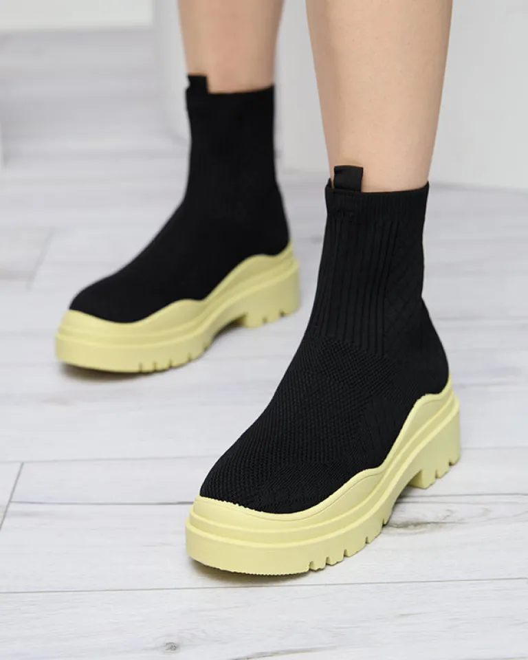 - Stylowe damskie wsuwane botki wykonane z materiału tkaninowego. Model na masywnej kolorowej podeszwie, posiada wnętrze wyłożone tkaniną. Idealna baza dla wielu codziennych looków! CZARNO-ŻÓŁTE BUTY BOTKI NIEOCIEPLANE SERITIS