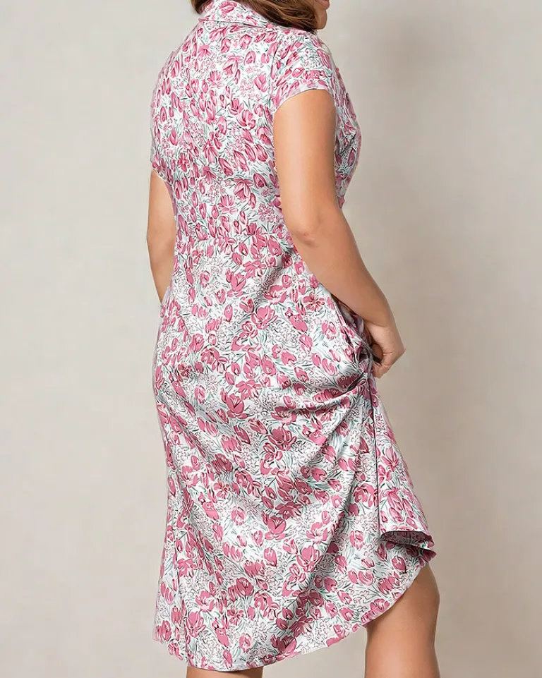 - Wyjątkowa damska sukienka wykonana z lekkiej tkaniny we wzór w kwiaty. Posiada kołnierzyk i jest zapinana na guziki. Produkt o długości midi, bez rękaw. Poczuj lato w tym modelu!