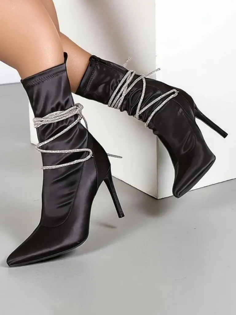 - Eleganckie botki na szpilce wykonane z tkaniny a’la satyna. Nosek zakończony w szpic, cholewka zdobiona cyrkoniami. Zapięcie na suwak. Świetne buty do jesiennych kreacji!