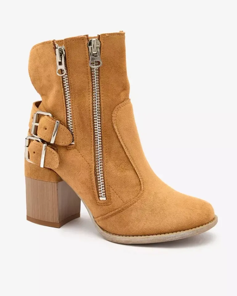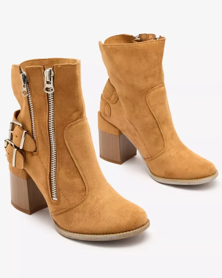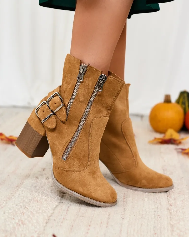 - Stylowe damskie botki na słupku, cholewka zdobiona sprzączkami i wykonana z eko-zamszu, w środku tkaninowa wkładka. Model zapinany na suwak po wewnętrznej stronie. BUTY DAMSKIE BOTKI NIEOCIEPLANE FEIRRGO