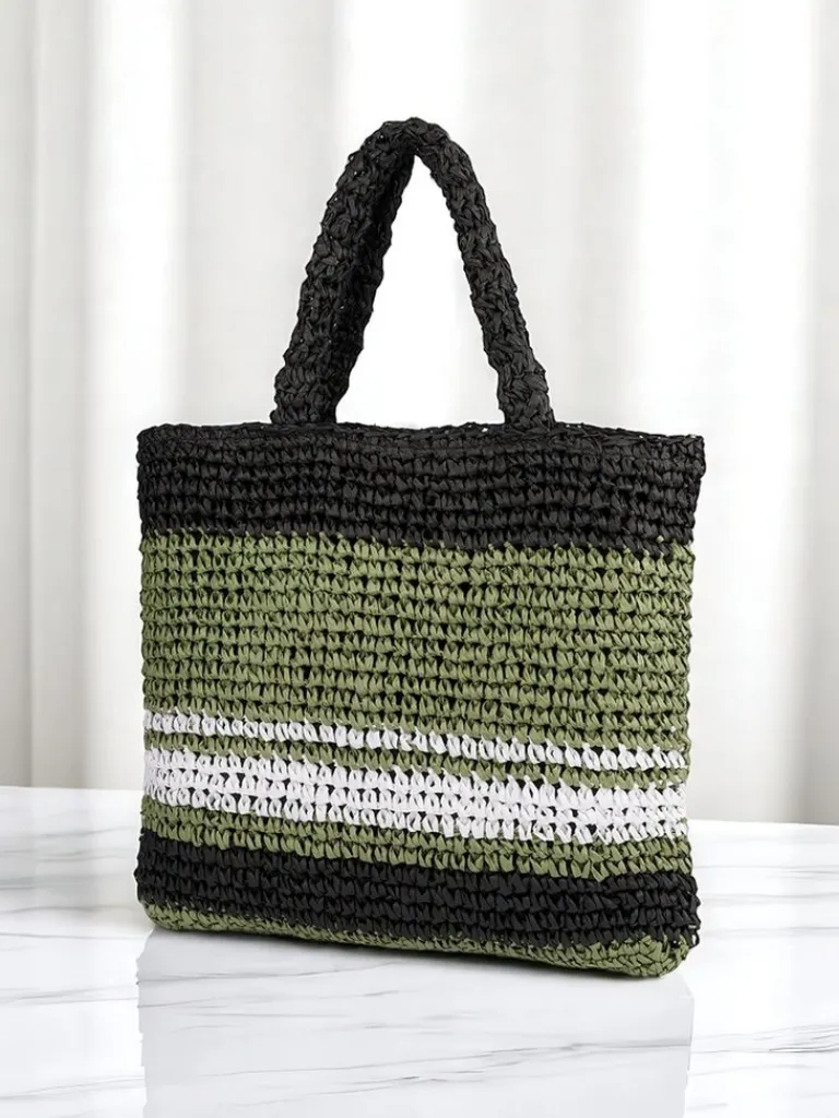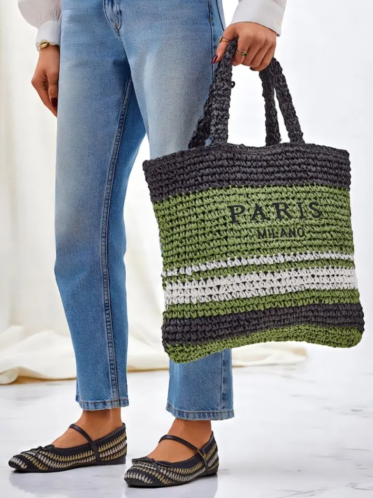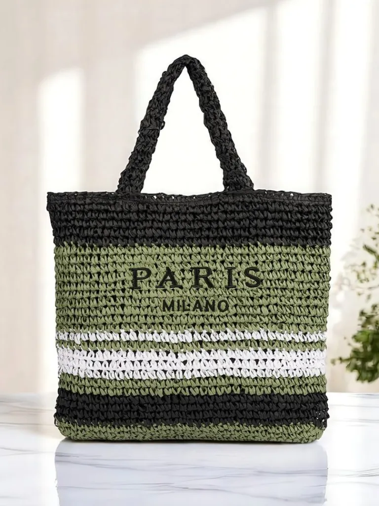 - Duża, pleciona torebka słomiana z paskowym wzorem. 1 komora, kieszonka, zamek. Idealna na lato – pojemna, stylowa i gotowa na każdą przygodę!