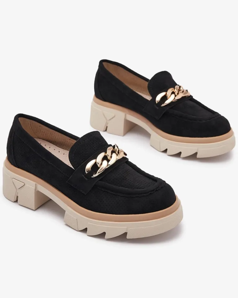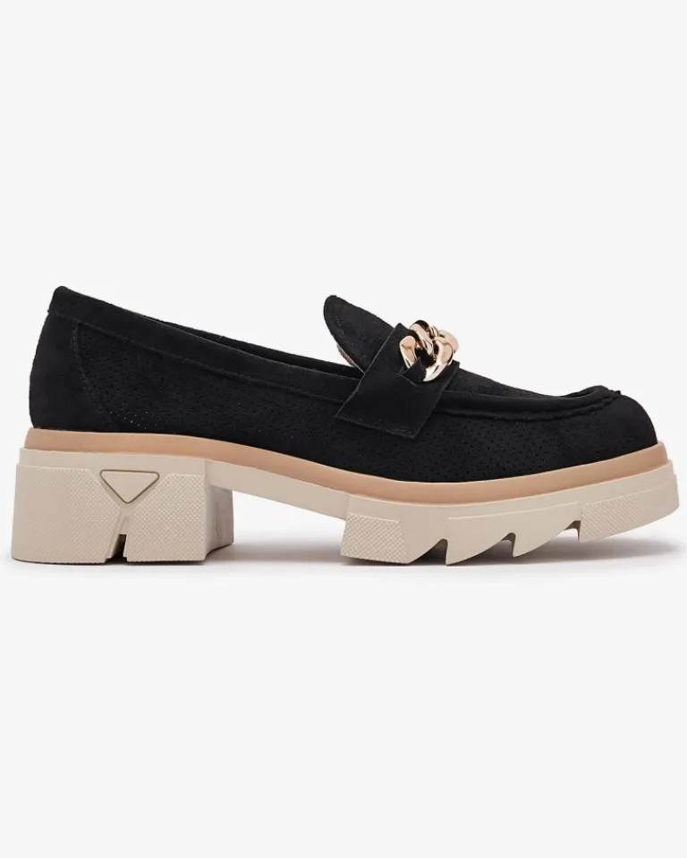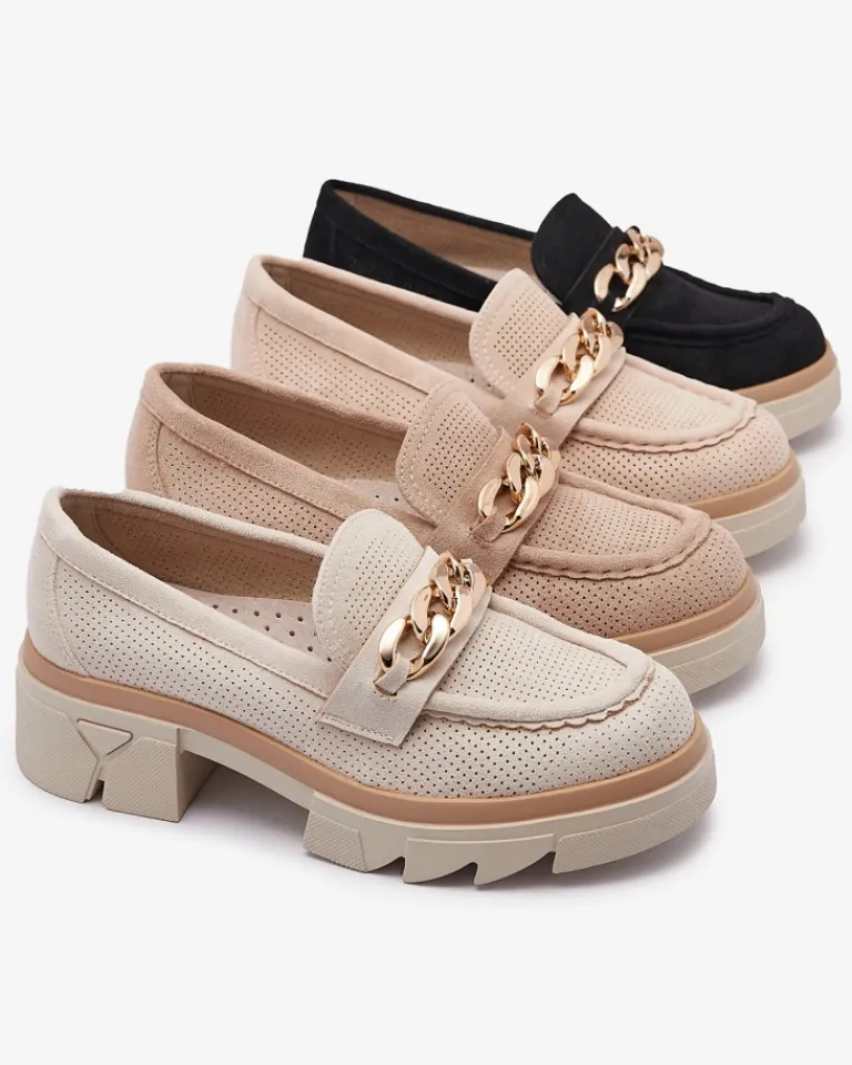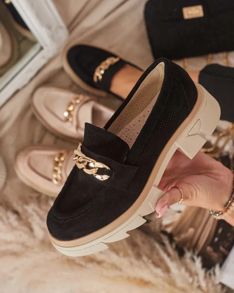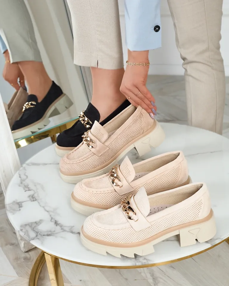 - Przepiękne damskie mokasyny na masywnej podeszwie. Model w tylu casual, jest wykonany ze skóry ekologicznej zamszowej z ażurowym wykończeniem, a wkładka to skóra naturalna. Na nosku złota ozdoba. Idealne do tworzenia stylowych outfitów!