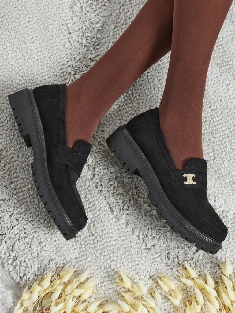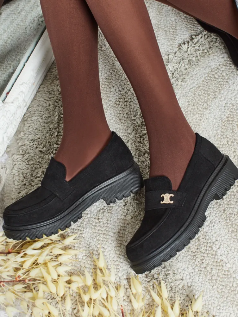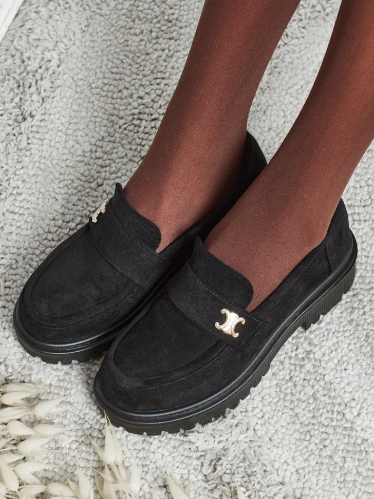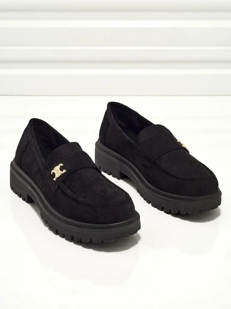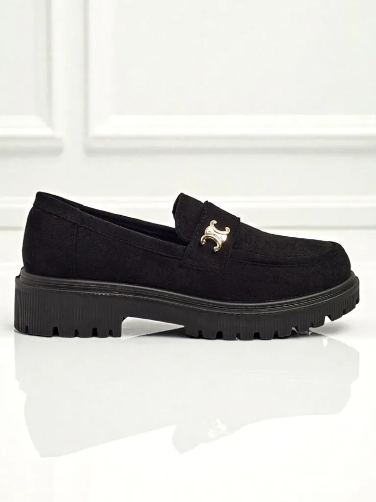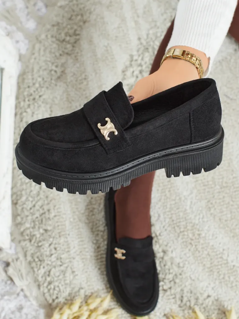 - Eko zamszowe mokasyny damskie na płaskim obcasie z eko skórzaną wkładką. Wygodne i eleganckie, idealne do codziennych stylizacji. Modny design z ozdobną klamrą.