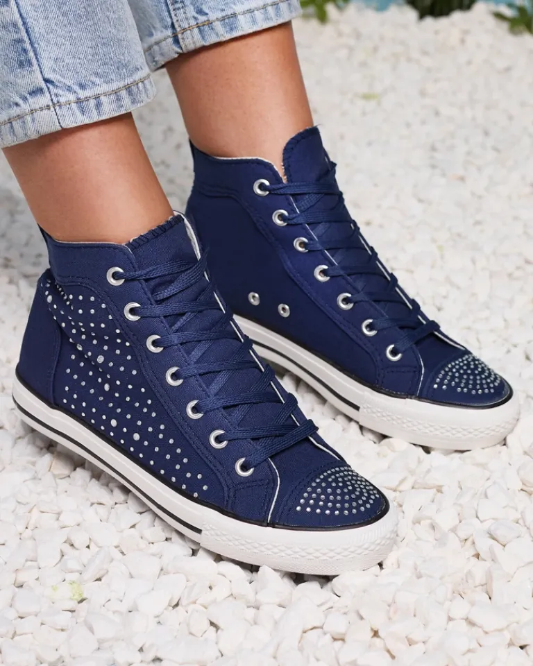 - Sznurowane trampki z wysoką cholewką, wykonane z tkaniny. Wnętrze również jest wyłożone tkaniną. Zewnętrzna strona obuwia zdobiona cyrkoniami. Bardzo wygodne dzięki miękkiej, gumowej podeszwie. Te obuwie pasuje do wielu codziennych stylizacji!