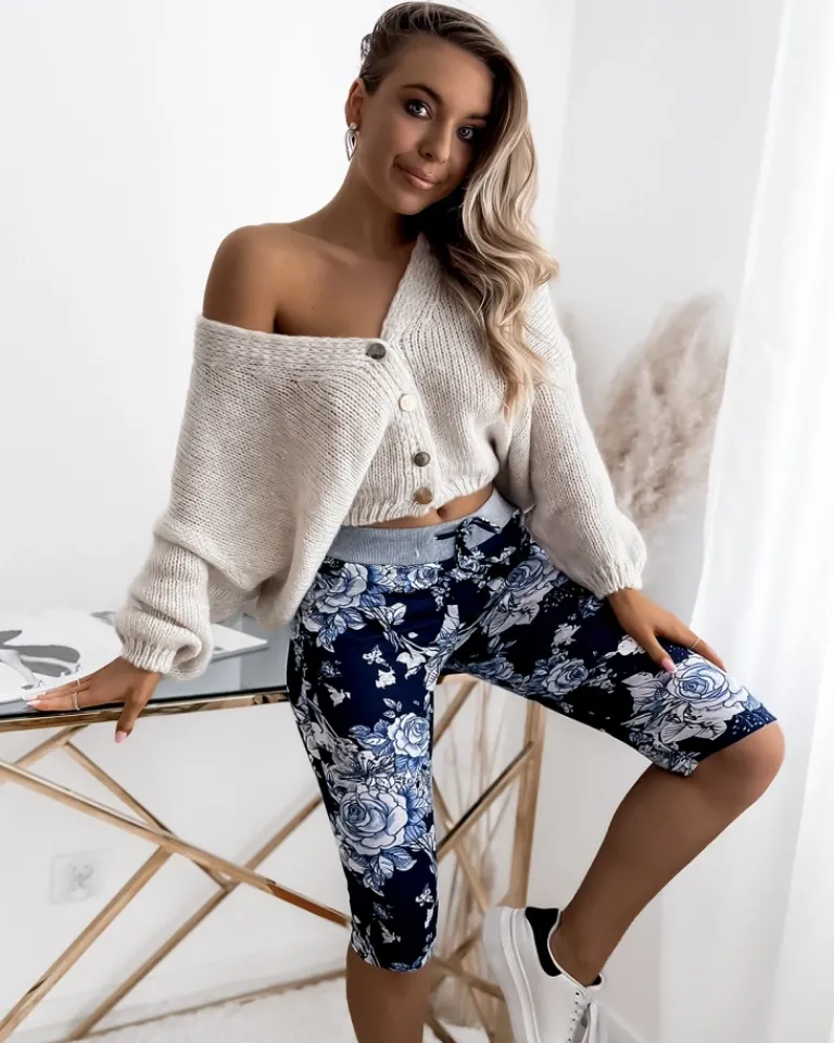 - Wygodne damskie materiałowe spodenki o długości 3/4, wykonane z tkaniny bawełnianej. Model posiada średni stan, gumkę w pasie oraz 2 wsuwane kieszenie. UWAGA: Dokładność pomiaru (+/-) 1 cm.