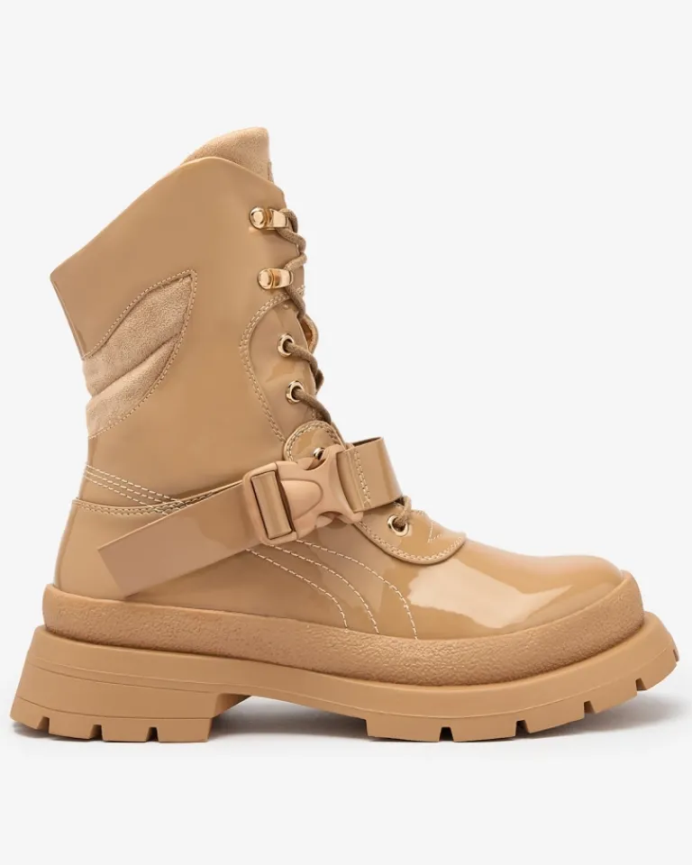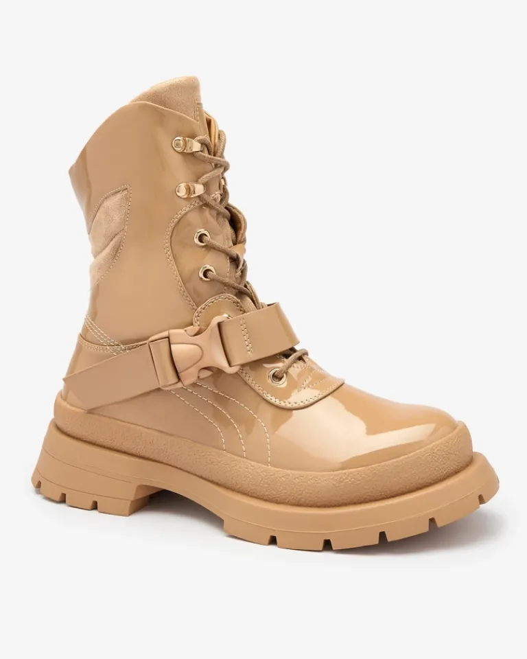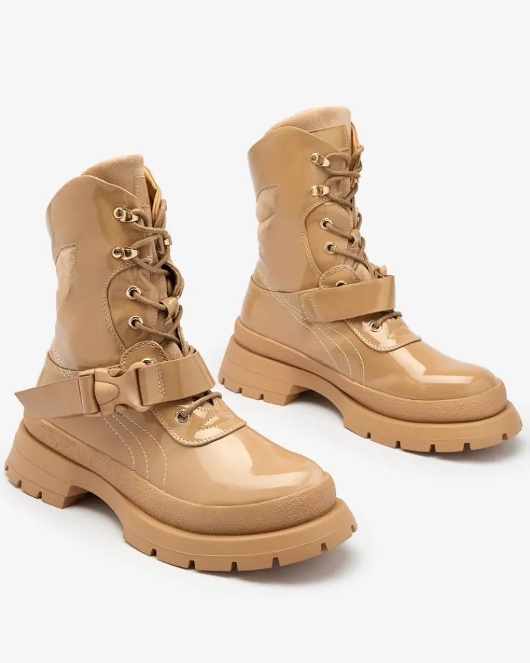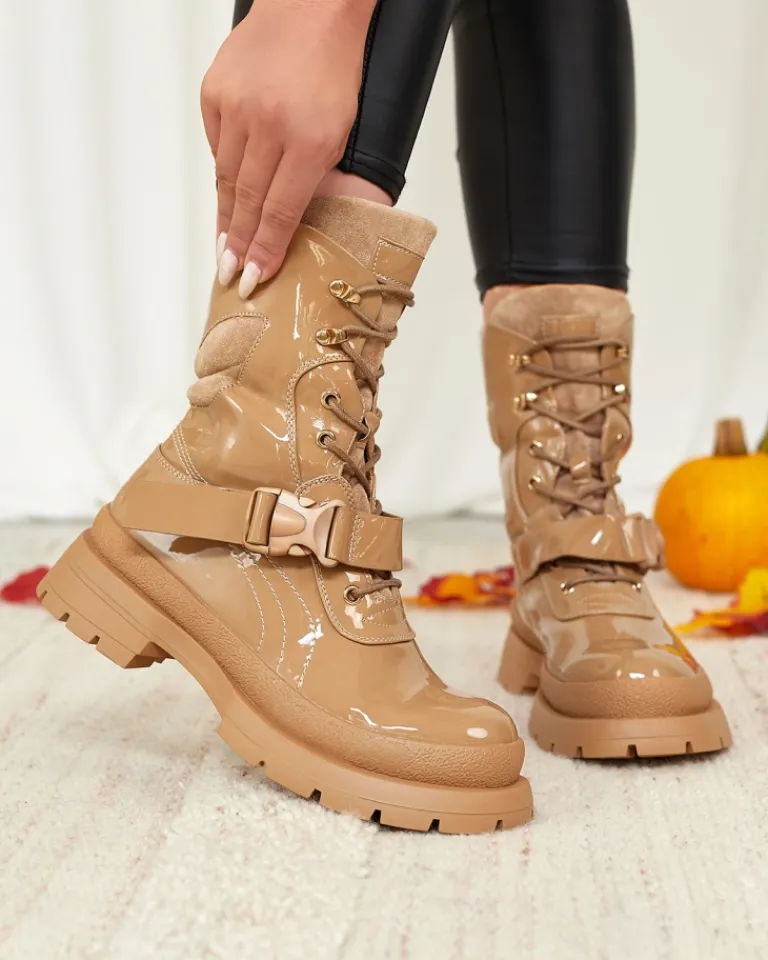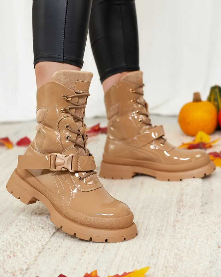 - Damskie botki na grubszej podeszwie, wykonane z eko skóry lakierowanej. Środek wyłożony cienką pianką, wkładka zaś tkaninowa. Model sznurowany z dodatkową klamrą. JASNOBRĄZOWE DAMSKIE NIEOCIEPLANE BUTY BOTKI SETOGY