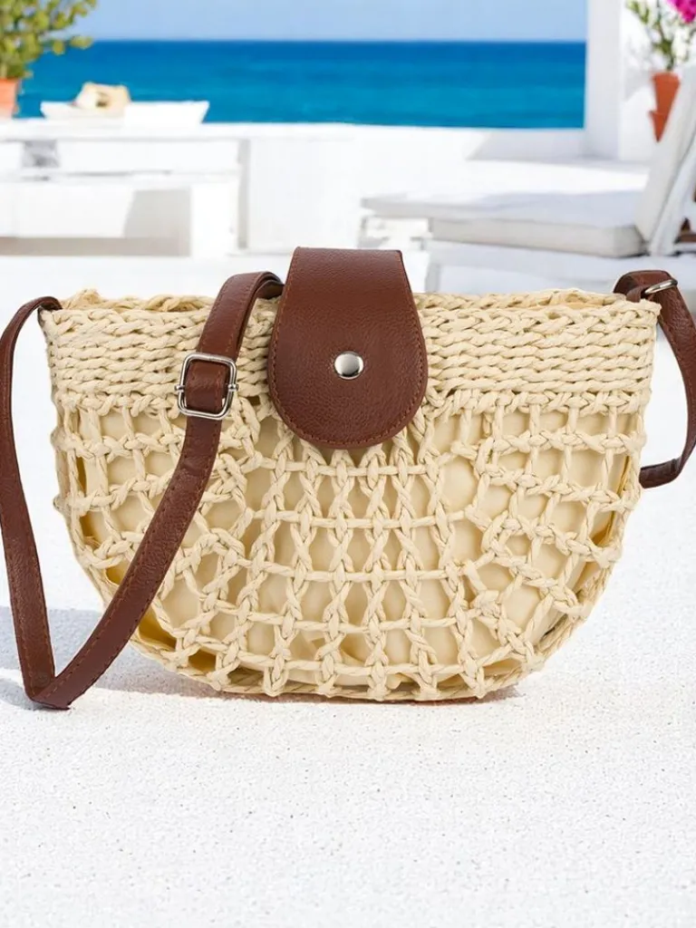 - Mała, półokrągła torebka słomiana, pleciona, z 1 komorą i kieszonką. Zapinana na zamek – lekka, stylowa, idealna na lato i miejskie spacery!